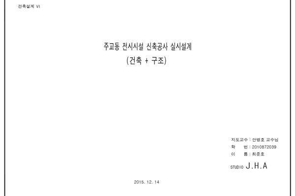* 과제내용 :이전의 디자인 스튜디오에서 배우고 익힌 설계지식을 종합하여 시공을 전제로 한 디자인으로 완성하는 단계이다. 건축 관련 분야인 토목, 구조, 기계설비, 전기설비 등의 기술지식을 고려하고 피난과 안전설계, 무장애설계, 에너지 절약 등의 법적인 기준과 실무적 내용을 반영하여 통합적인 실시설계 도서를 작성하는 능력을 배양한다.* 포스트내용 :- 대표이미지 1개- 과제포스트 - 평면도 2개 (1/100~200) - 입면도 2개 (1/100~200) - 단면도 1개 (1/100~200) - 확대 단면도 1개 (1/50) - 상세도 1개 (1/20~10)* 과제 제출 요령오픈아카이브 메뉴얼 바로가기* 과제제출 주의사항대표 이미지:!!내용: 잘 찍은 사진, 과제의 대표성 강조가시성: 300px X 300px 크기에서 잘 읽히는 내용을 담을 것.용량: 1mb 이하.* 각 이미지는 용량 2M 이하