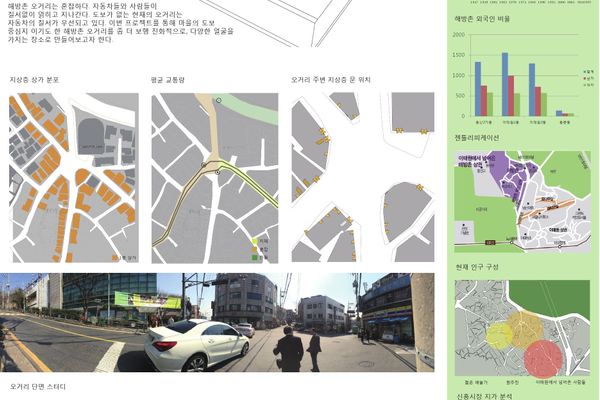 * 과제내용 : 대상부지의 물리적 상황들과 맥락을 관찰한 후 특징적인 건축 패턴이나 도시 현상을 분석하고 표현한다. 도시분석을 통해 발견한 아이디어와 개념을 해방촌오거리 디자인에 적용하여 발전시킨다.* 포스트내용 :- 대표사진 (1장): 300px X 300px (해방촌오거리 디자인 개념의 부분)- 이미지: 도시분석 다이어그램 및 맵핑, 해방촌오거리 설계안- 설명: 주제명 및 팀원 기재 후 도시분석을 통해 추출한 생각과 비판을 한 단락으로 요약 후, 해방촌 오거리 디자인에 적용한 개념과 제안을 한 단락으로 기술