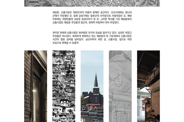 * 과제내용 : 신흥시장의 증개축을 위하여 기존 건물의 도시적 맥락, 구조, 이용현황 등을 분석하고 해석하여 프로그램, 구조의 변형, 환경조절과 효과 등에 대한 전략을 스터디한다.* 포스트내용 :- 대표이미지: 프로그램, 구조, 환경조절에 관한 스터디 중 전체적인 컨셉을 가장 잘 반영하는 이미지나 스케치 (전체 혹은 부분 확대도 가능)- 제출사항(1) 프로그램: 도시에 대한 분석으로부터 프로그램의 도출, 시나리오 작성 등 작업한 이미지들을 모두 jpeg로 변환하거나 스캔하여 업로드(2) 구조: 구조적 개념을 설명하기 위하여 수행한 선례 조사 내용 중 대표적인 이미지나 해석, 분석하여 만든 이미지만 제출 (원본 그대로 사용할 경우 출처 반드시 기재) / 구조적 개념을 보여주는 다이어그램이나 스케치(3) 환경 조절: 단열, 채광, 환기 등에 관한 환경 조절에 대한 전략을 보여주는 스케치나 다이어그램(4) 이외 공간, 형태, 동선, 코어 등의 가능성: 위의 세가지 분석 대상 외에 학생 개별적으로 수행하였던 공간, 형태, 동선, 코어의 배치 등에 대한 전략을 제안(5) 각각의 제안 항목에 대하여 두,세줄의 문장으로 간략하게 기존 상황에 대해 제안하는 전략에 대한 합리성과 타당성을 설명