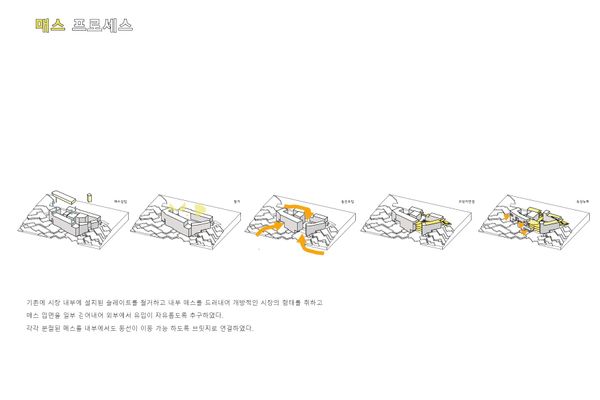 * 과제내용 : 신흥시장의 증개축을 위하여 기존 건물의 도시적 맥락, 구조, 이용현황 등을 분석하고 해석하여 프로그램, 구조의 변형, 환경조절과 효과 등에 대한 전략을 스터디한다.* 포스트내용 :- 대표이미지: 프로그램, 구조, 환경조절에 관한 스터디 중 전체적인 컨셉을 가장 잘 반영하는 이미지나 스케치 (전체 혹은 부분 확대도 가능) - 제출사항 (1) 프로그램: 도시에 대한 분석으로부터 프로그램의 도출, 시나리오 작성 등 작업한 이미지들을 모두 jpeg로 변환하거나 스캔하여 업로드 (2) 구조: 구조적 개념을 설명하기 위하여 수행한 선례 조사 내용 중 대표적인 이미지나 해석, 분석하여 만든 이미지만 제출 (원본 그대로 사용할 경우 출처 반드시 기재) / 구조적 개념을 보여주는 다이어그램이나 스케치 (3) 환경 조절: 단열, 채광, 환기 등에 관한 환경 조절에 대한 전략을 보여주는 스케치나 다이어그램 (4) 이외 공간, 형태, 동선, 코어 등의 가능성: 위의 세가지 분석 대상 외에 학생 개별적으로 수행하였던 공간, 형태, 동선, 코어의 배치 등에 대한 전략을 제안 (5) 각각의 제안 항목에 대하여 두,세줄의 문장으로 간략하게 기존 상황에 대해 제안하는 전략에 대한 합리성과 타당성을 설명