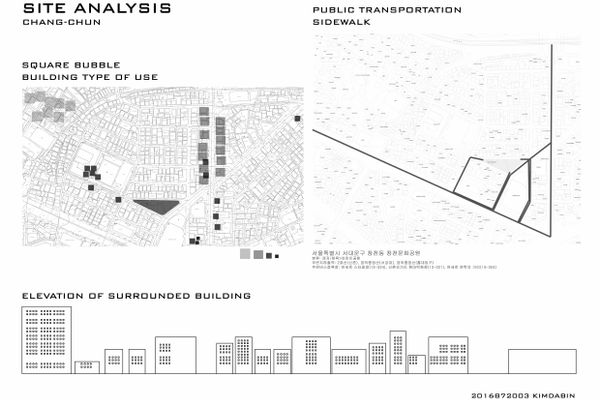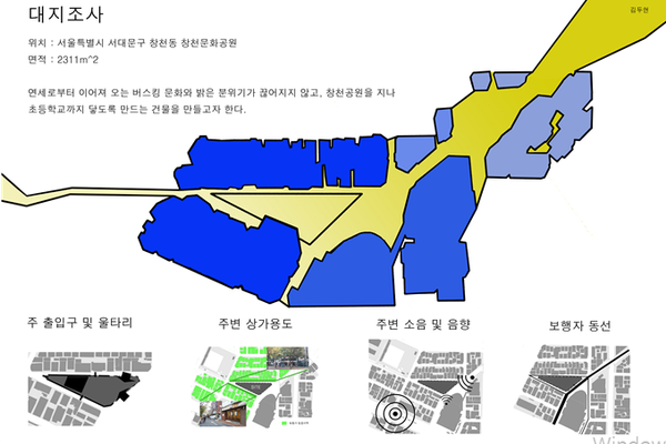 * 과제내용 : 건축가들에게 도시는 항상 창작의 영감을 불어넣어주는 원천이었다. 두번째 프로젝트 첫 과제는 ‘홍대/상수’라는 도시 지역을 탐구와 분석의 대상으로 삼는다. 이 프로젝트는 우리가 사는 일상의 도시를 탐구하고 분석하고 도큐멘트하는 연구과제를 통해, 이러한 물리적 환경의 창출에 작용하는 각종 사회적, 역사적, 문화적, 경제적, 법규적, 행태적 요인들을 분석하고 평가하는 사고를키우는 것을 목표로 한다. 또한 현상과 요인들의 핵심 인자로 작동하는 사람들의 행위, 행동 등도 관찰하고 문서, 도면 혹은 도식으로 기록한다.이 과제를 통해 본 프로젝트 대상지의 도시적 맥락 이해와 개념 도출을 위한 행태 분석 작업을 통해 프로그램작성 및 본격적인 설계과제로 넘어갈 수 있는 개념과 준비가 갖추어질 것으로 기대한다.* 포스트내용 :도시분석 패널을 JPEG로 전환하여 업로드하며, 각 다이어그램에 대한 설명을 기술