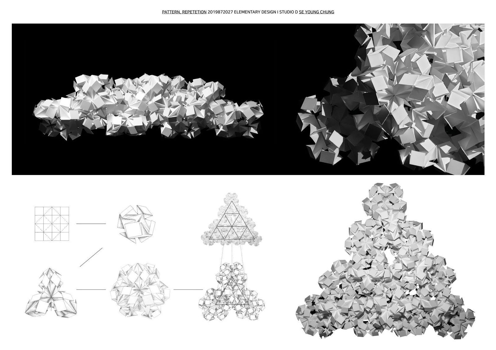 이 모델에는 작은 삼각형이 모여 큰 삼각형을 이루고 하나의 유닛에 붙어있는 작은 사각형이 규칙을 만든다.