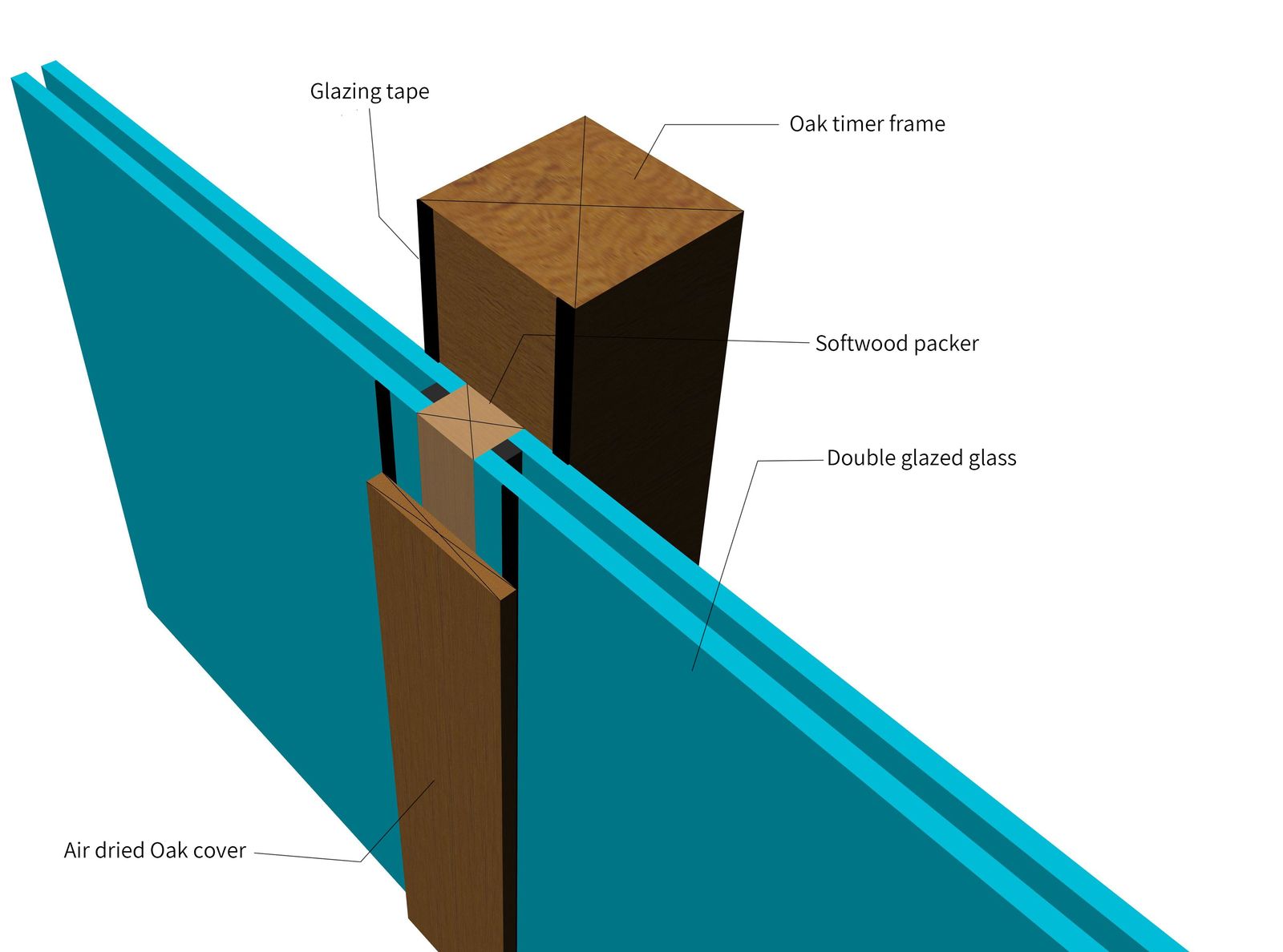 Glass units are fixed onto the out side of the wood frame. And the glass and fixings are secured to the frame with cover boards that preserve the look of the timber frame. There is a glazing tape between the frame and the glass, so glass is not directly attached to the oak frame and will not be effected by the movement of the timber frame.