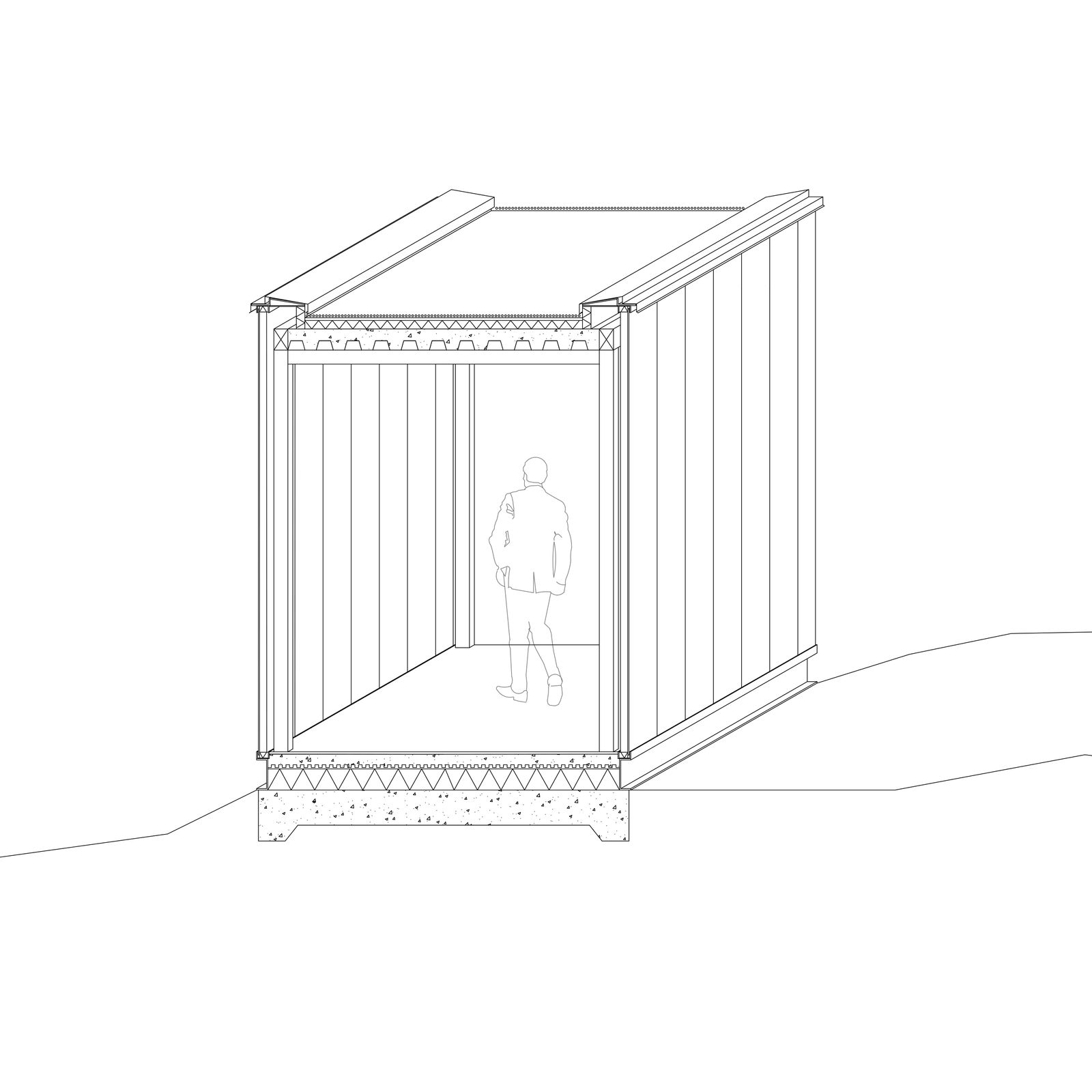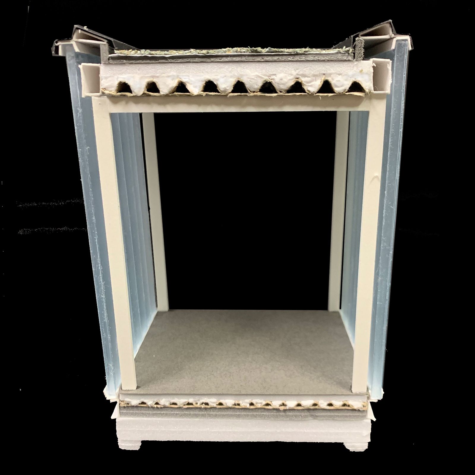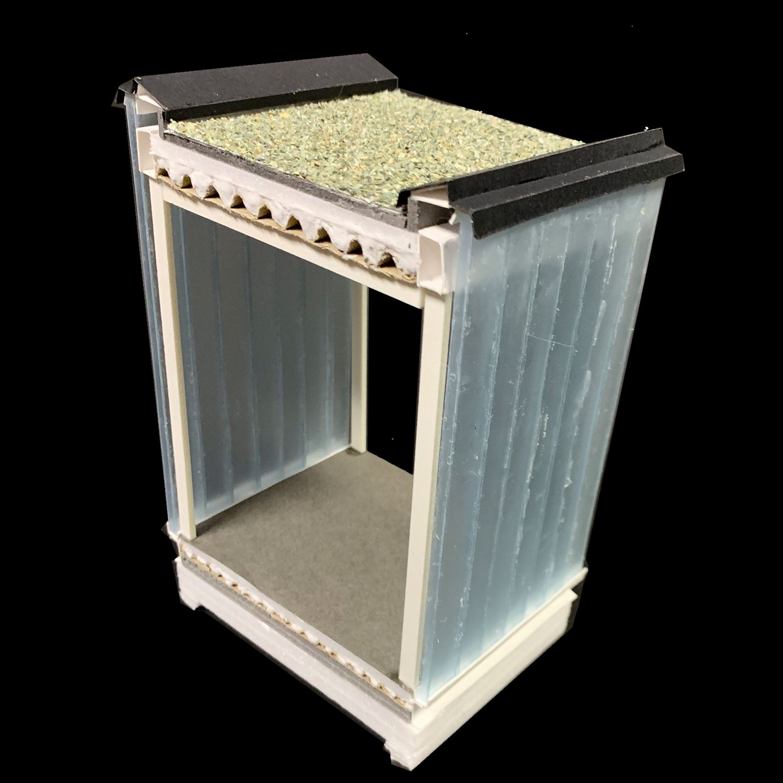 My section model shows how U glass facade system can be applied to building. I want to hide frames on facade as much as possible and I thought U glass is proper as U glass don’t need mullions up to 6 meters. U glass can be double glazed by attached crossing each. Double gazed U glass is good for insulation and soundproof. As I want to make building look like it is floating on the ground, I use steel structure members under the frames. They make shadow and hide the structure bearing the load. To minimize the horizontal glass frame on top of the facade, I connected the parapet and frame. There are gaps between columns and U glass facade to make column’s shadow invisible from outer view. To make the gap between columns and U glass facade, Parapet’s length is adjusted as it connects with U glass frame.