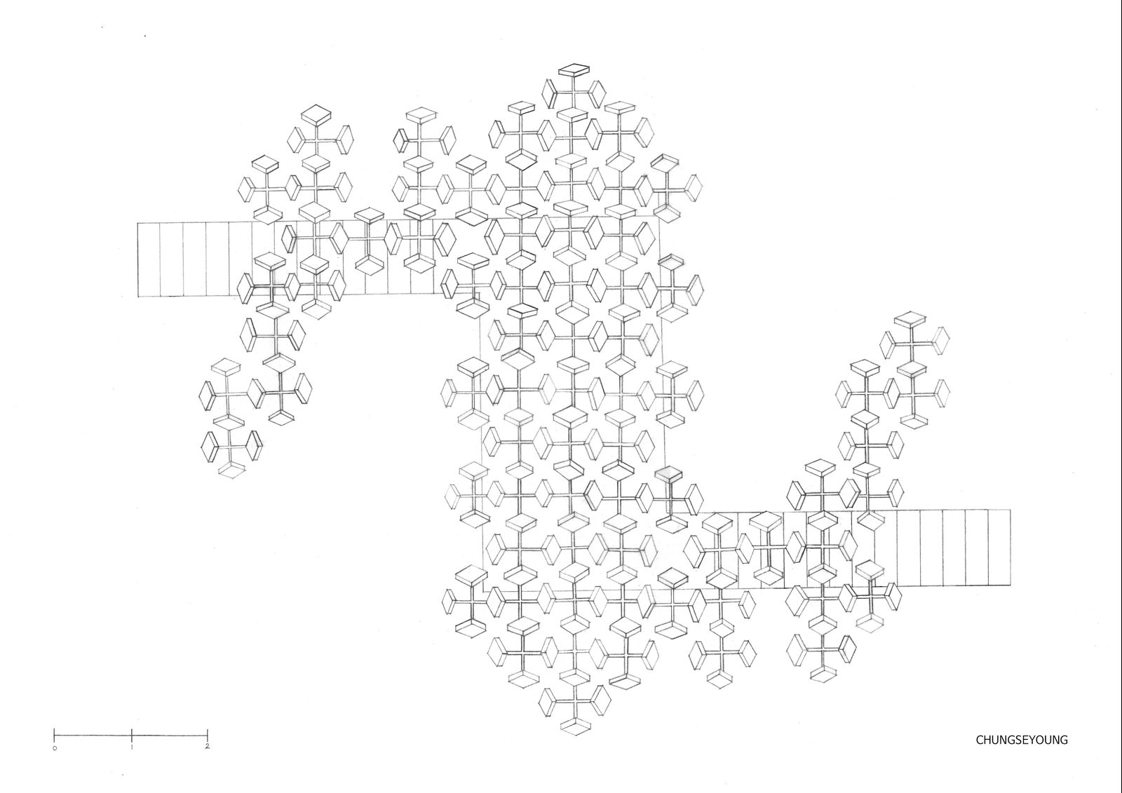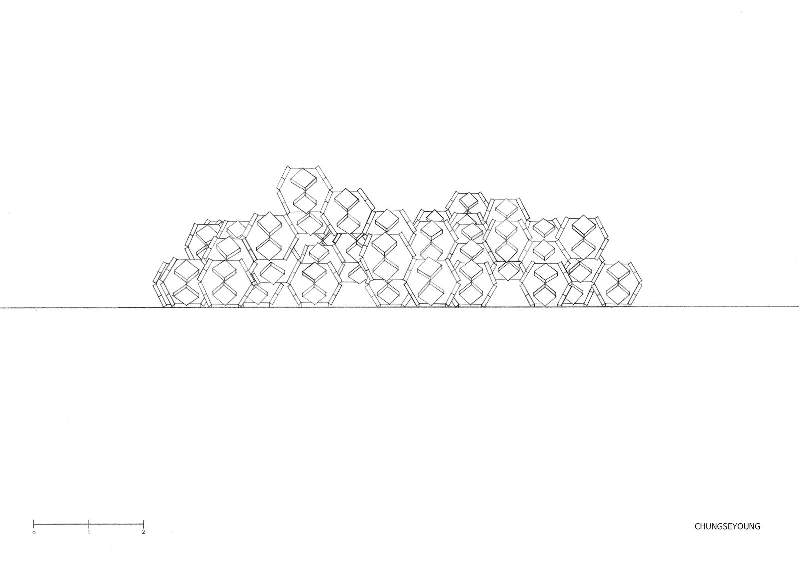 위에서 이 파빌리온을 바라보게 되면 가운데는 두껍고 밀도가 높다. 왜냐하면 1차 모듈에서 유닛의 생김새에 의해 생겨나는 밀도감이 가장 큰 특징이라고 생각했었고, 이를 3차 과제에도 적용하고 싶었기 때문이다.