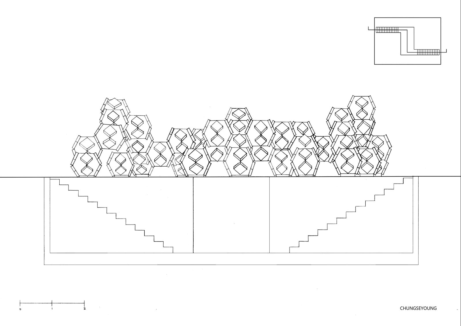 입구부터 계단부분은 가운데에 비해 다소 얇은데, 파빌리온 전체가 큰 밀도감을 가지고 있으면 단조롭고 부해보인다고 생각하여 얇게 구상했다.