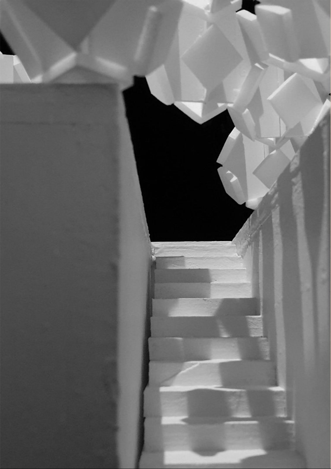 사진은 1인칭 시점에서 계단 위쪽을 바라보는 모습, 모델의 전반적인 모습을 대각선 방향에서 찍은 모습, 조명을 바로 위에 설치한 다음에 계단 아래를 바라보는 모습이다.