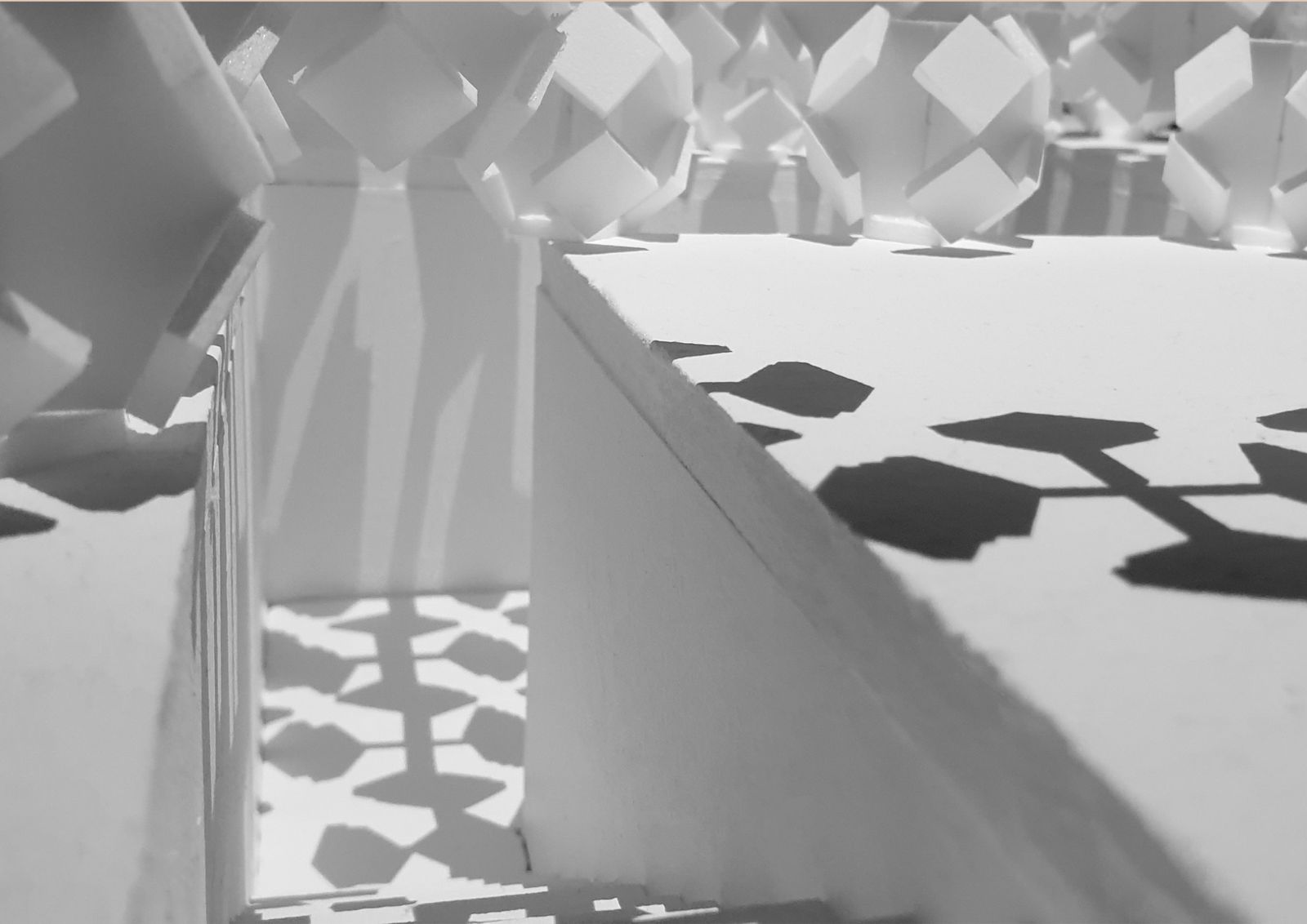 이렇게 통로를 덮는 형식으로 제작하게 되면 가운데통로의 대부분을 파빌리온의 그림자가 차지하기 때문에 햇빛도 차단되고, 사람들은 벽이나 일부 바닥에 생기는 그림자를 보며 유닛의 구조를 인지할 수 있다.