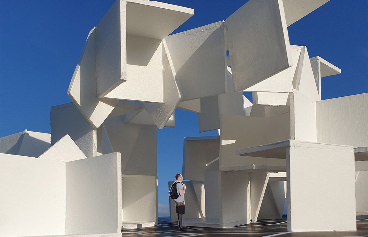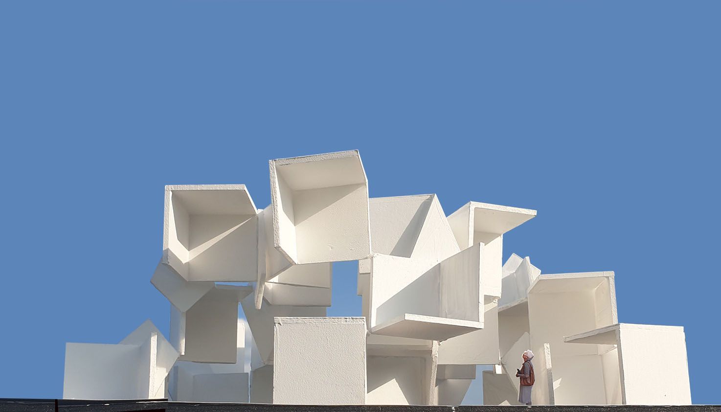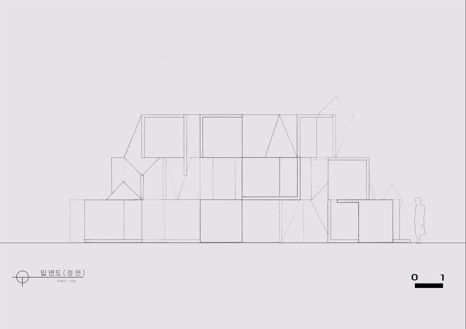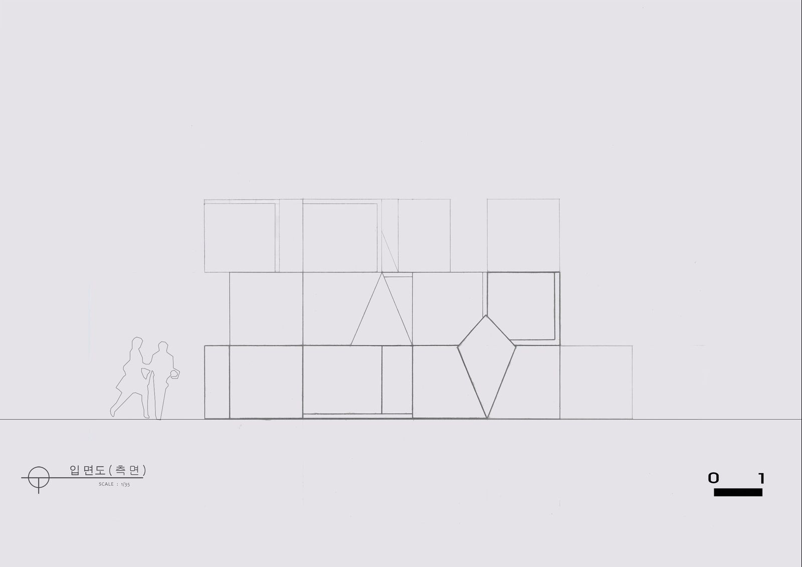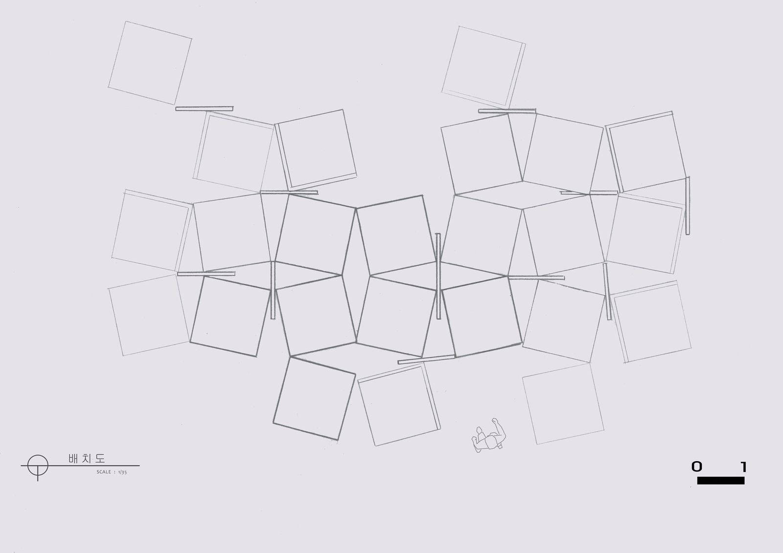 1차 과제의 결과물인 모형은 평면적인 형태를 가지고 있어 파빌리온으로서의 입체적 변화를 창의적으로 해내기 어려울 것이라 판단했다. 따라서 모형을 만드는 데 사용한 기본 유닛과 기본 유닛을 이어서 만든 중간 유닛을 사용해 새로운 공간을 구성했다. 단 붙이는 방식은 1차 과제에서 모형을 만들 때 사용한 방식을 고수했다. 이는 1차 과제에서와 마찬가지로 기본 유닛이 가진 큐브라는 성질이 상쇄되지 않도록 하기 위함이었다. 그로써 1차 과제에서 나타난 패턴이 파빌리온에서 나타날 수 있음을 확인했다. 의도적으로 파빌리온을 위에서 본 모습이 1차 과제의 모형을 정면에서 봤을 때의 패턴의 반복과 같도록 했다. 이를 강조하기 위해 바닥에 패턴을 깔았다. 위가 막힌 동굴과 비슷한 형태의 큰 공간과 사용한 유닛의 큐브라는 특성으로 인해 작은 방과 같은 공간들이 만들어졌다. 이 공간들은 각도에 따라 그저 막힌 벽이나 기둥으로 보이기도 하고, 방과 같은 들어갈 수 있는 공간으로 보이기도 한다. 2층으로 이루어진 공간에서 3층으로 이루어진 공간으로 확대하여 공간의 위요감을 느낄 수 있도록 설계했다. 모형의 크기는 30:1 스케일이다.