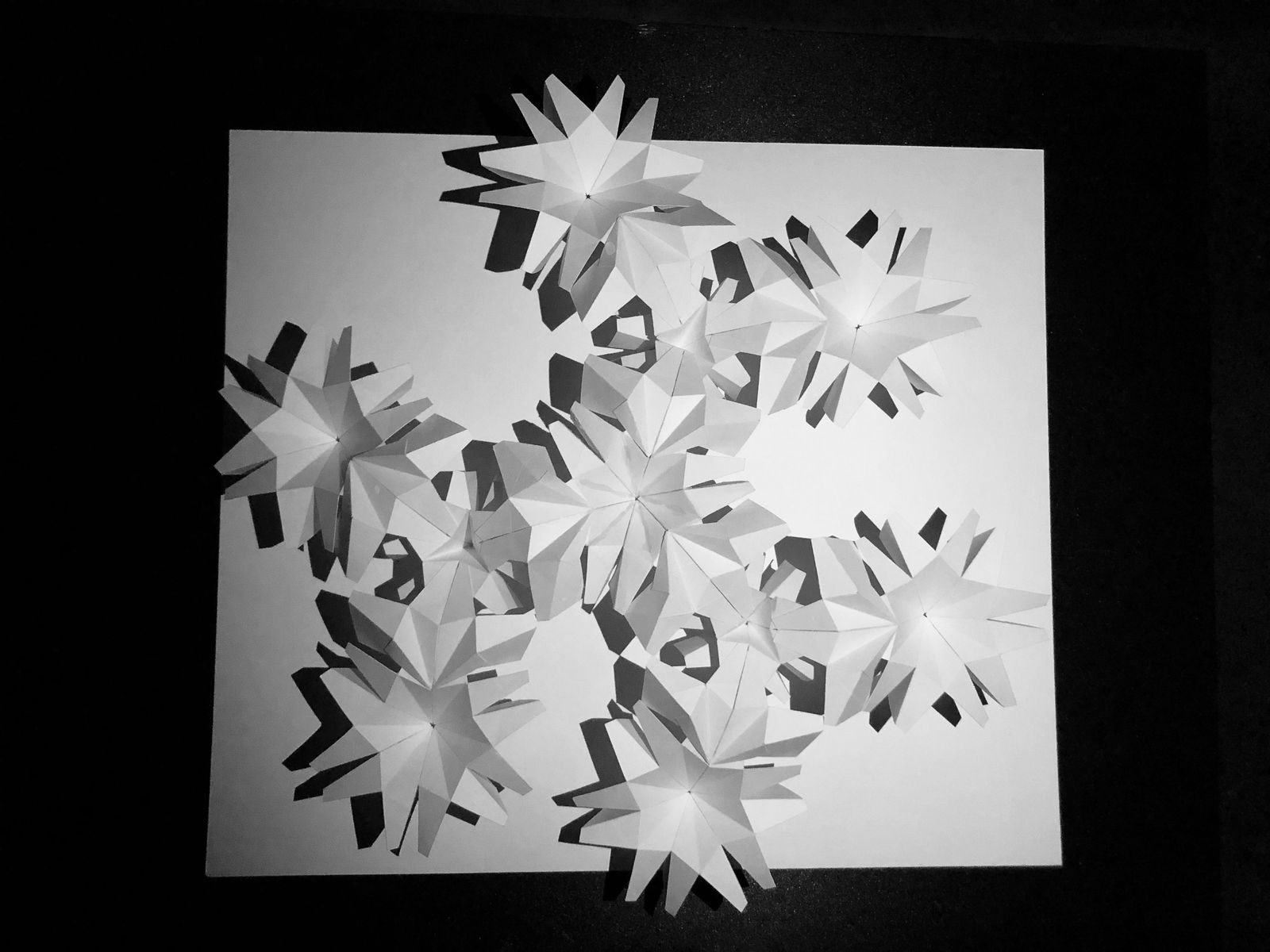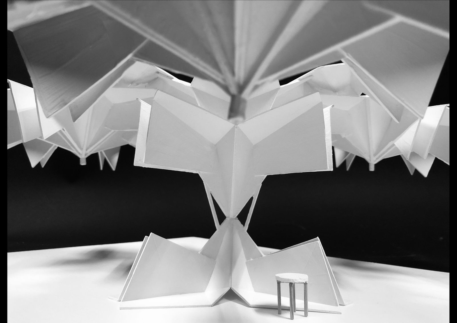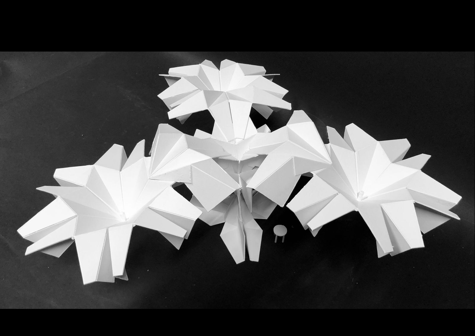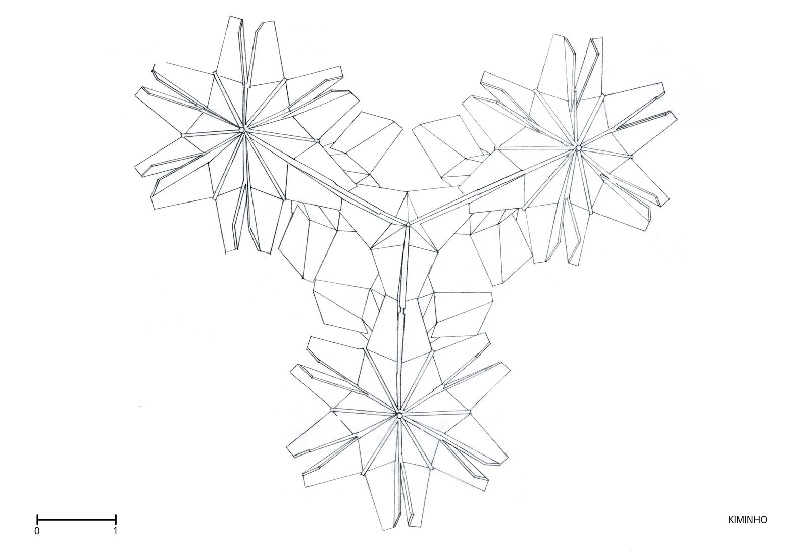 1차 과제에서 사용했던 기본 유닛을 그대로 사용해 파빌리온을 만들었다. 1차때, 모듈들의 패턴이 잘 보이지 않는 부분을 개선하고자 모듈을 쌓아 올리기보다 평면에 넓게 배치했다. 이 파빌리온은 중심과 중심에 연결된 3개의 동일한 모듈이 반복되어 만들어진다. 제작은 2T두께 우드락으로 만든 뒤 마무리 제쏘작업을 통해 현실감을 높였다.