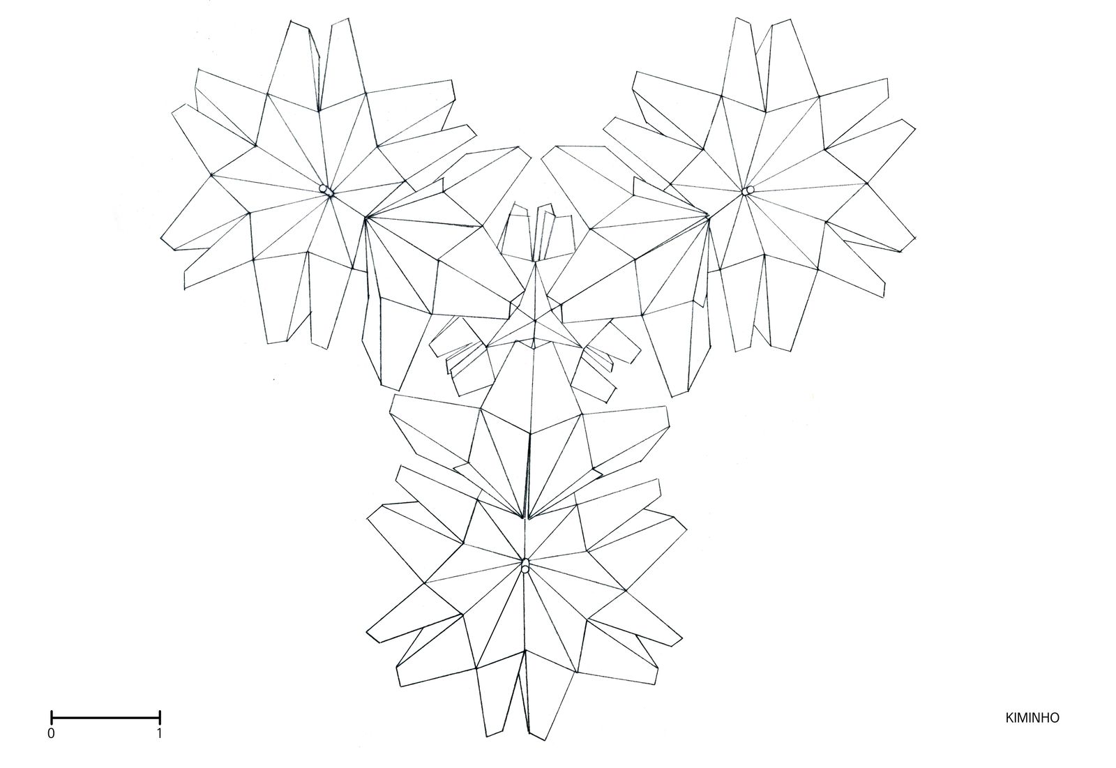 파빌리온의 중심은 총 6개의 모듈로 만들었다. 모듈 3개를 삼각형 형태로 붙여 총 2개의 삼각형 모듈을 만들었다. 이 모듈을 쌓아올리면 파빌리온의 중심이 되는 모듈이 나온다. 하지만 이 모듈을 지지대로 삼게 되면 불안정하기 때문에 기존 모듈을 조금 변형시켜 평면이 나올 수 있도록 했다.