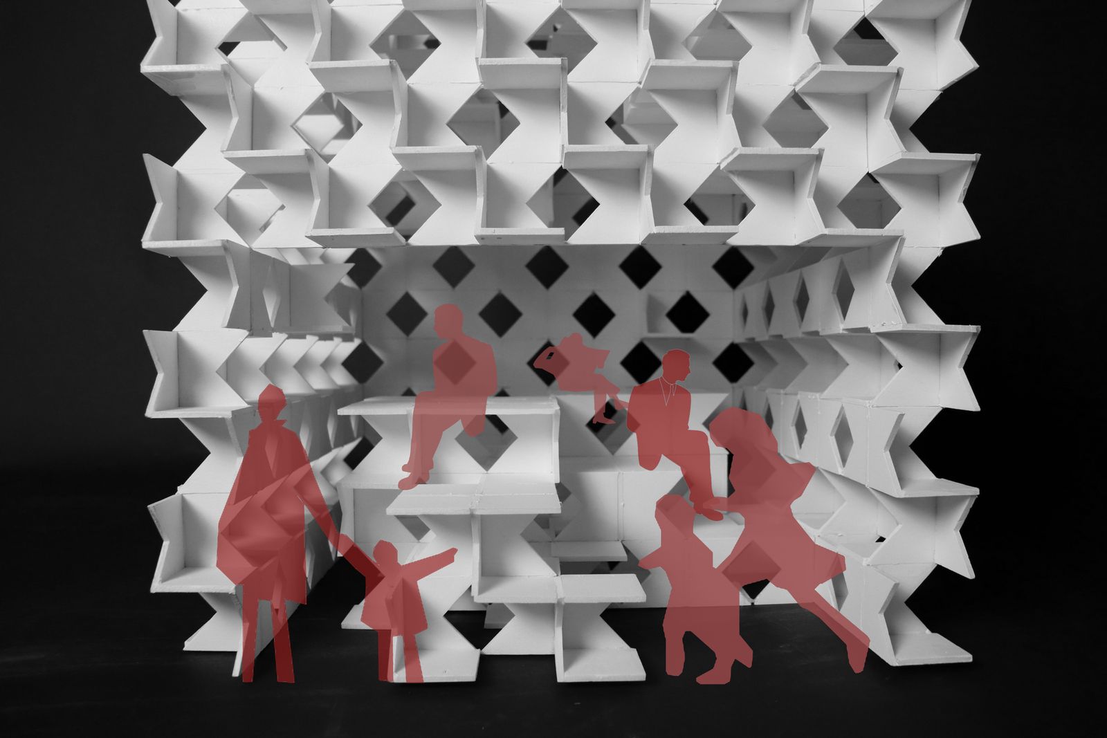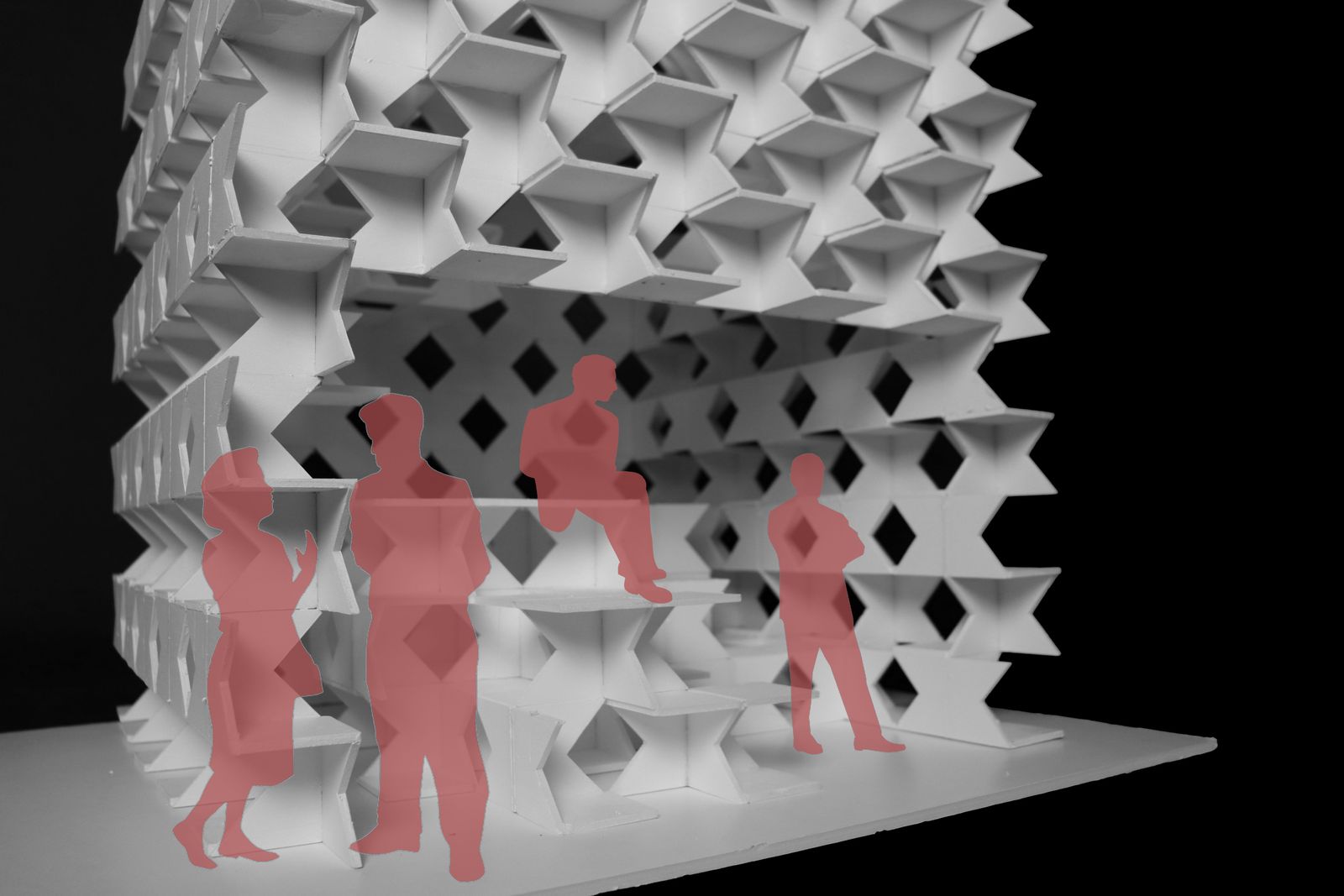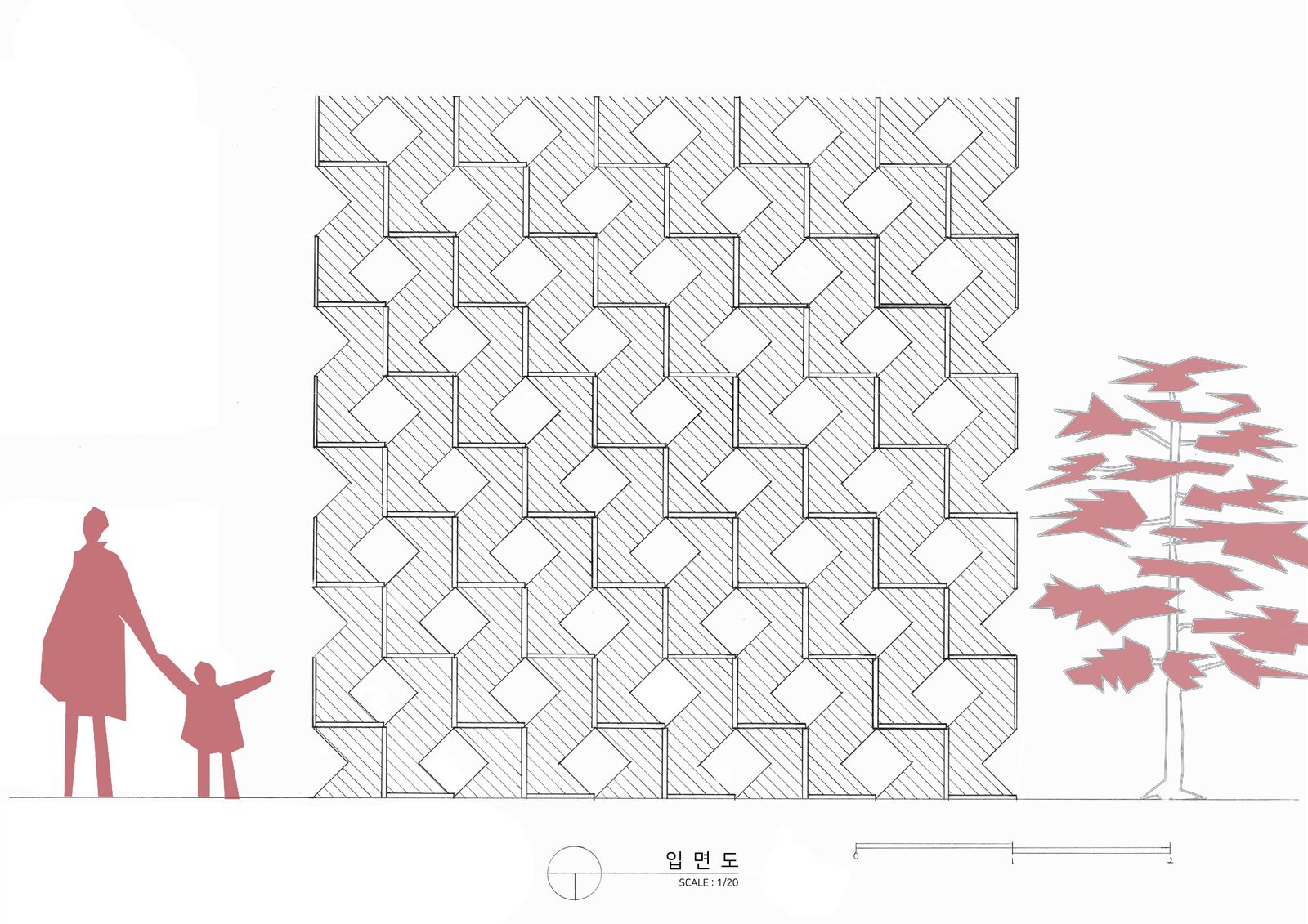 따라서 첫번째 목표를 달성하기 위해 쌓는 1차 과제의 최종 모델과 쌓는 방식을 동일하게 하여 그것에서 보였던 여러가지 패턴이 보일 수 있게 하였고 1차 과제의 기본 모듈이 '큐브'였기 때문에 이 컨셉을 더욱 발전시키고 명확하게 하기 위해 최종적으로 제작할 파빌리온 또한 거대한 큐브 형태가 되게 하였다.