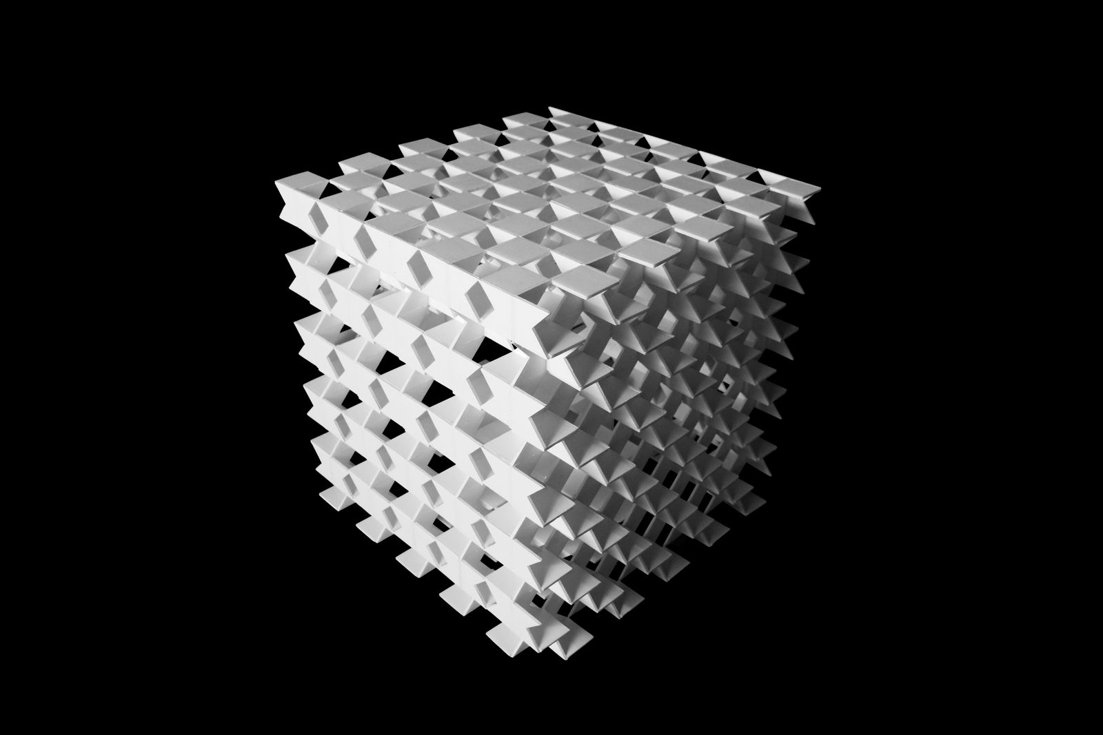 두번째는 기본 모듈의 분석이 필요했다. 기본 모듈은 45mmX45mmX45mm이고 정육면체의 세면이 제거되어 있는 형태이다. 따리서 이 모듈의 스케일이 1:10이라면 실제 사용하게 될 파빌리온에서 모듈은 한 모서리의 길이가 45cm가 되고 이것은 사람들이 앉기에 가장 적합한 높이라고 판단했다. 별도로 가구를 제작할 필요없이 패턴을 만들어 내는 모듈이 그것의 역할을 할 수 있다. 하지만 이 부분도 별다른 이유없이 무작위로 파빌리온에 부착하고 배치하게 되면 컨셉이 모호해 질 수 있기 때문에 기본 모듈을 1X1X1이라고 한다면 모듈을 4개 부착하여 2X2X2, 9개를 부착하여 3x3x3의 큐브를 제작하고 배치하여 큐브라는 컨셉을 명확하게 하였다.
