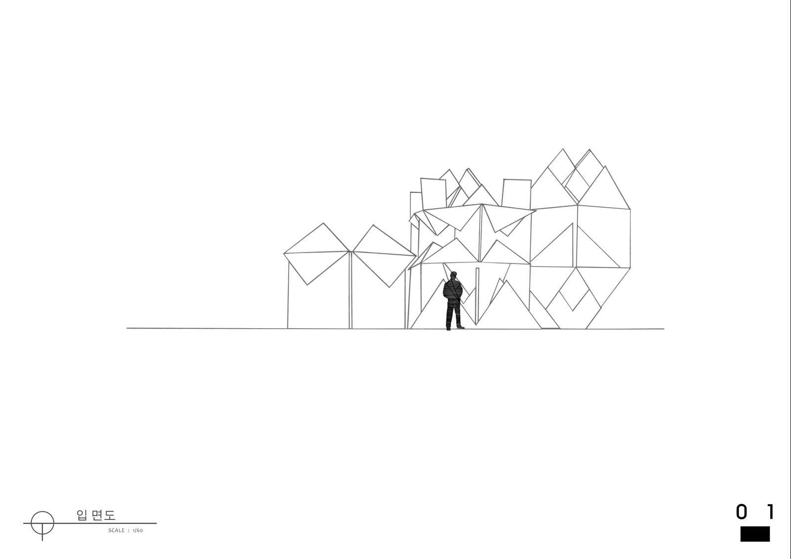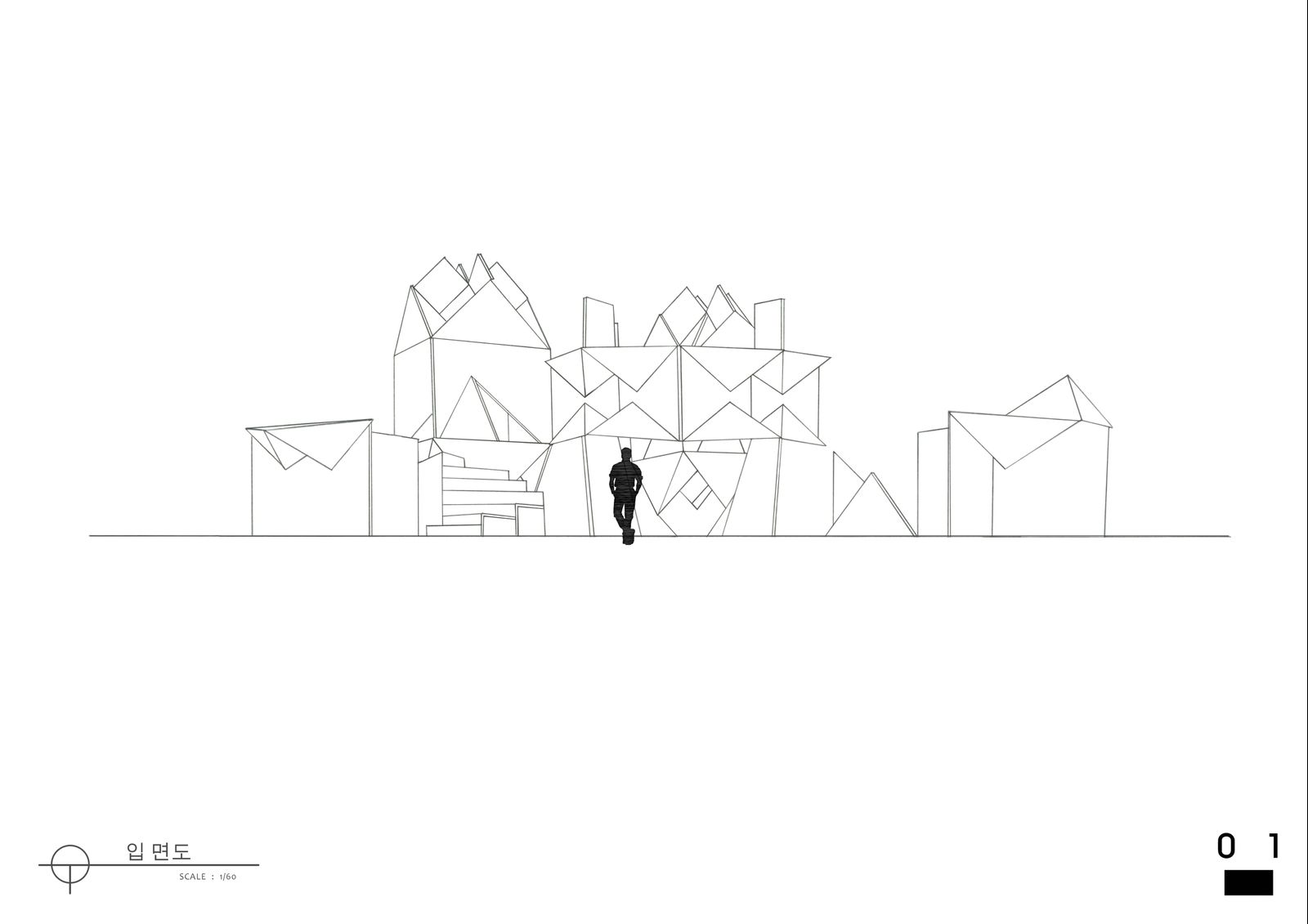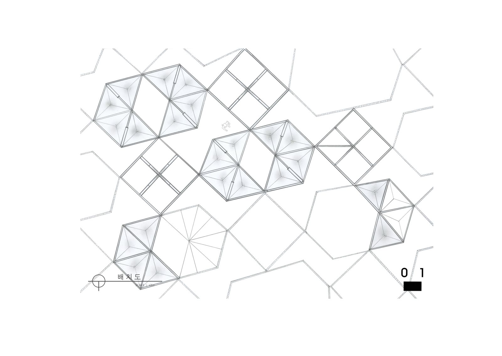 1차 과제의 모형을 어떻게 활용하여 파빌리온으로 만들어야 할 지 고민하던 중, 제 1차 과제의 가장 큰 특징은 특이한 패턴이라고 생각해서 이를 최대한 강조한 파빌리온을 만들기로 하였습니다. 먼저 제 패턴의 핵심 부분이었던 중간에 나비 모양의 보이드가 있는 부분을 강조하기 위해 이 부분을 확장시킨 후 지붕으로 만들었습니다. 지붕 아래에 기둥은 패턴의 진한 선으로 되어있는 부분을 확장시키되, 단순히 위아래로만 확장하는 것이 아니라 사선으로 확장시켜서 사람의 눈높이에서 봤을 때 미로같은 느낌이 들도록 하였습니다. 이대로 완성시키기보다는 사람들이 조금 더 다양한 체험을 할 수 있는 공간을 만들고 싶었습니다. 밑판에 패턴을 단순화시켜서 타일을 깔아 주었고, 이 패턴 위에 랜덤하게 구조물들을 올려놓아서 전체적으로 질서가 있는 것 같으면서도 그 속에 랜덤한 재미를 찾을 수 있도록 구성하였습니다. 크게 세 가지 공간으로 나눌 수 있는데, 사람들이 돌아다니며 미로를 해결하는 듯한 재미를 찾을 수 있는 공간, 그늘 아래서 쉴 수 있는 공간, 그리고 2층 테라스로 나눌 수 있습니다. 그 외에도 2층으로 연결해주는 계단, 지붕과 바닥이 너무 동떨어져 있지 않은 느낌을 주기 위해 만든 조형물 등 부속적인 구조물들을 패턴에 맞추어 올려 놓음으로써 파빌리온을 완성하였습니다.