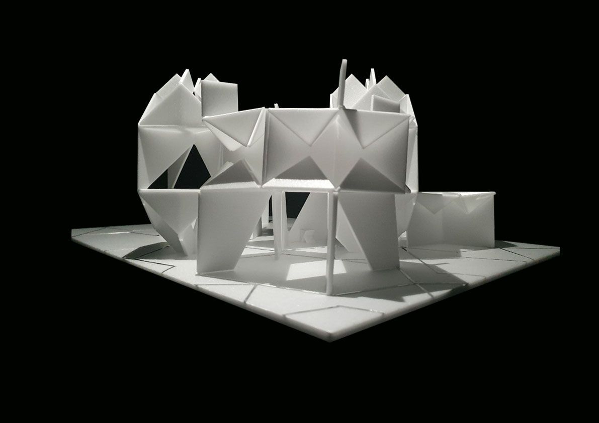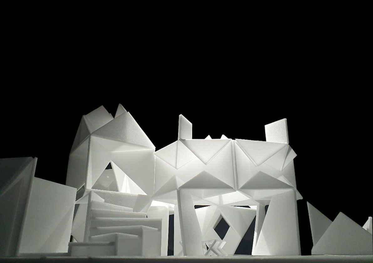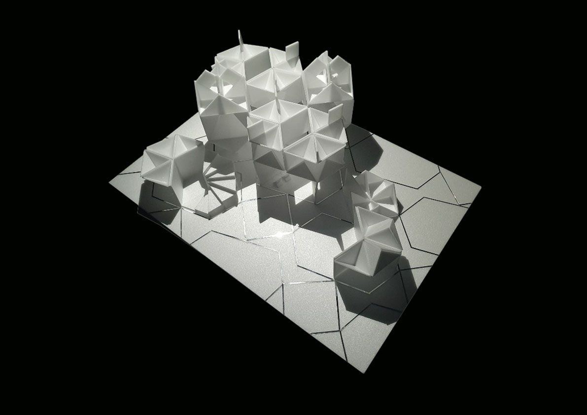 1차 과제의 모형을 어떻게 활용하여 파빌리온으로 만들어야 할 지 고민하던 중, 제 1차 과제의 가장 큰 특징은 특이한 패턴이라고 생각해서 이를 최대한 강조한 파빌리온을 만들기로 하였습니다. 먼저 제 패턴의 핵심 부분이었던 중간에 나비 모양의 보이드가 있는 부분을 강조하기 위해 이 부분을 확장시킨 후 지붕으로 만들었습니다. 지붕 아래에 기둥은 패턴의 진한 선으로 되어있는 부분을 확장시키되, 단순히 위아래로만 확장하는 것이 아니라 사선으로 확장시켜서 사람의 눈높이에서 봤을 때 미로같은 느낌이 들도록 하였습니다. 이대로 완성시키기보다는 사람들이 조금 더 다양한 체험을 할 수 있는 공간을 만들고 싶었습니다. 밑판에 패턴을 단순화시켜서 타일을 깔아 주었고, 이 패턴 위에 랜덤하게 구조물들을 올려놓아서 전체적으로 질서가 있는 것 같으면서도 그 속에 랜덤한 재미를 찾을 수 있도록 구성하였습니다. 크게 세 가지 공간으로 나눌 수 있는데, 사람들이 돌아다니며 미로를 해결하는 듯한 재미를 찾을 수 있는 공간, 그늘 아래서 쉴 수 있는 공간, 그리고 2층 테라스로 나눌 수 있습니다. 그 외에도 2층으로 연결해주는 계단, 지붕과 바닥이 너무 동떨어져 있지 않은 느낌을 주기 위해 만든 조형물 등 부속적인 구조물들을 패턴에 맞추어 올려 놓음으로써 파빌리온을 완성하였습니다.