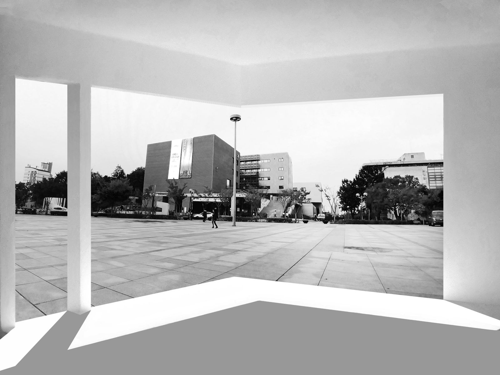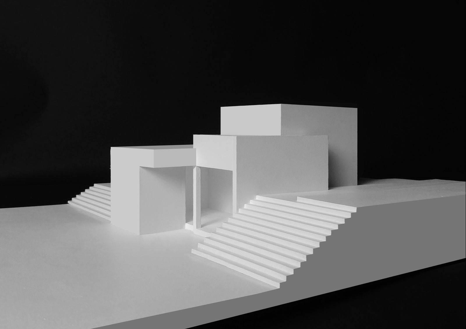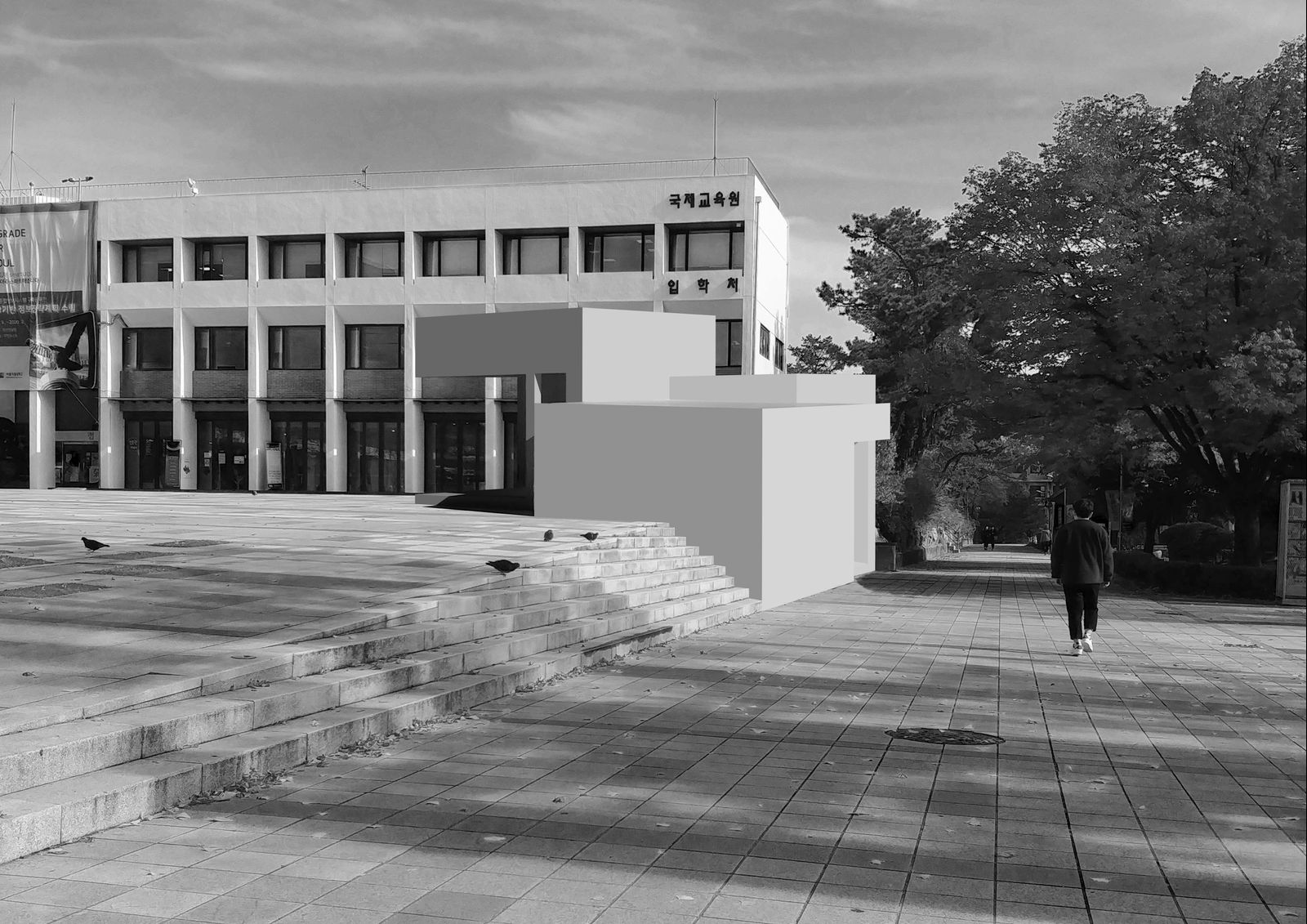 두 번째 과제는 1차 과제를 디벨롭하여 건물을 만들고, 그 건물의 사이트와 프로그램을 정하는 것이었다. 프로그램을 먼저 정하고 사이트를 정했으며, 그에 맞게 외형에 변화를 주었다. 프로그램은 서울시립대학교 기념품 샵과 카페이다. 주 프로그램이 기념품 샵이기 때문에 정문에서 가까우며, 유동인구가 많고, 건물에 맞는 단차가 나는 곳인 전농관 광장의 계단 쪽을 사이트로 정했다. 외형은 1차의 논리에서 크게 벗어나지 않는 범위에서 변형하였는데 큐브 3개가 합쳐져 있다는 것을 명확히 하기 위해 1층 부분의 큐브 한쪽을 깎아 내었다.
