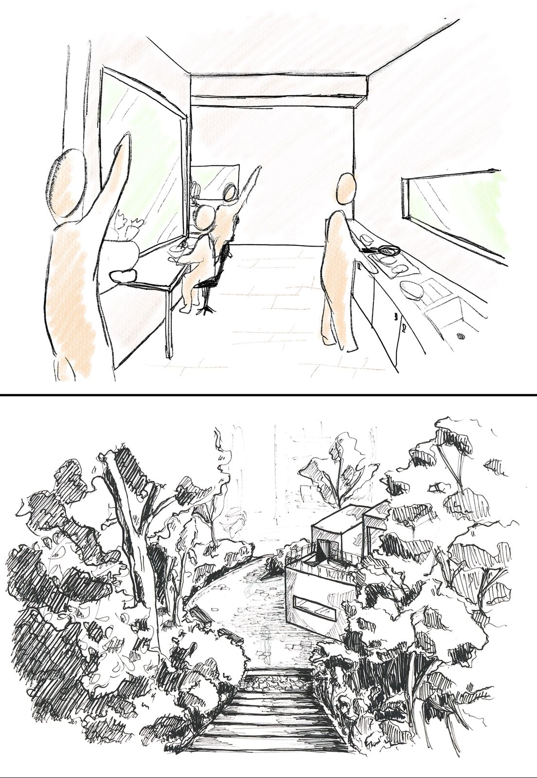 1층은 여러사람이 함께 요리하며 식사를 할 수 있는 공간으로 구상하였다. 따라서 가장 긴 벽면을 따라 일자형 조리대를 넣었고, 요리하는 사람의 시야에 맞춰 환기할 수 있는 긴 창을 배치했다. 꺾어진 공간은 다수가 함께 식사할 수 있는 공간이고 중정을 바라보는 메인 창을 따라 난 작은 공간은 1인이 식사할 수 있는 공간을 만들었다.