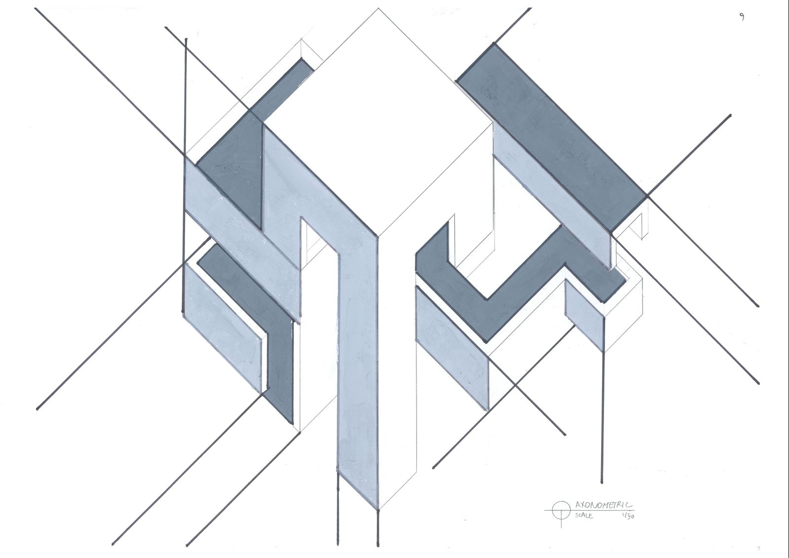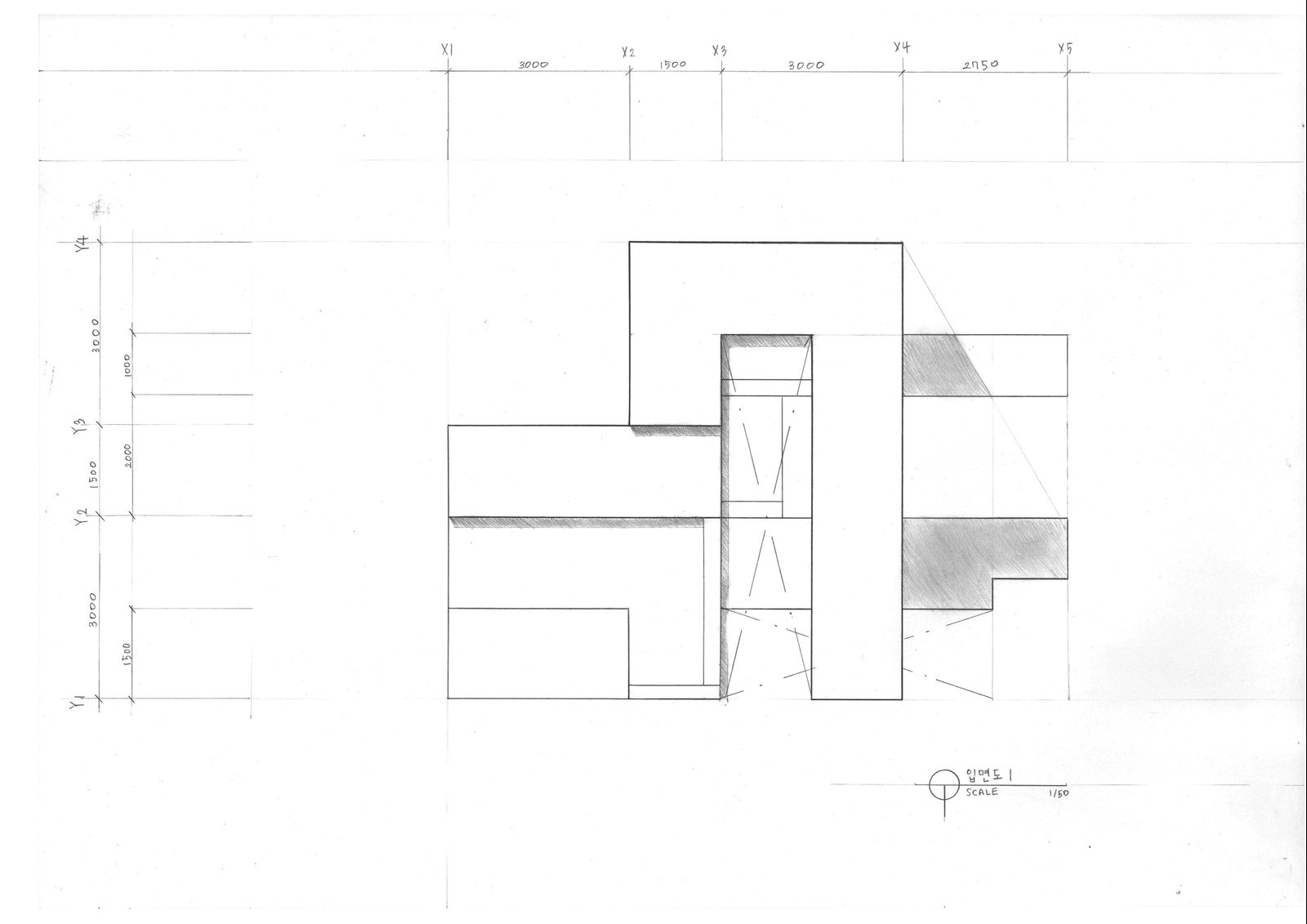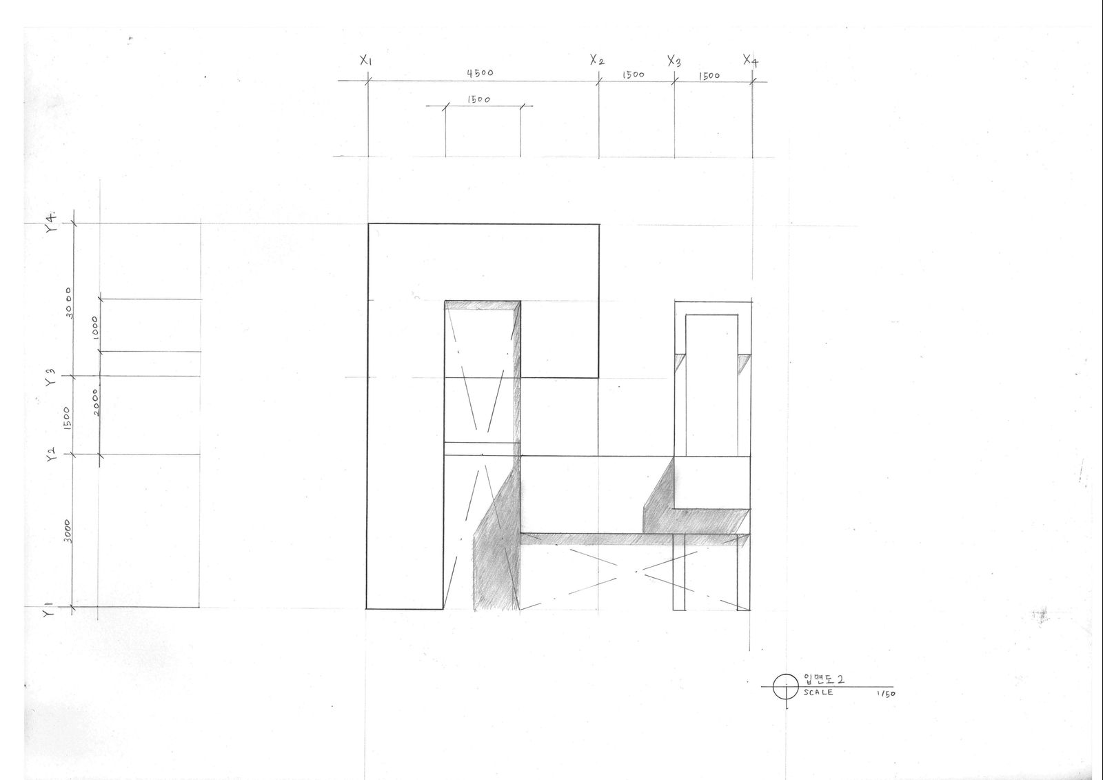 x,y,z 방향으로 선이 뻗어나가며 ㄷ 형태를 정면 뿐만 아니라 옆, 대각선에서도 볼 수 있게 만들었다. 중간의 ㄷ형태로만 이루어진 소스는 두개의 공간을 연결해주는 역할을 하며 보다 역동적인 모습을 가지게 해준다.