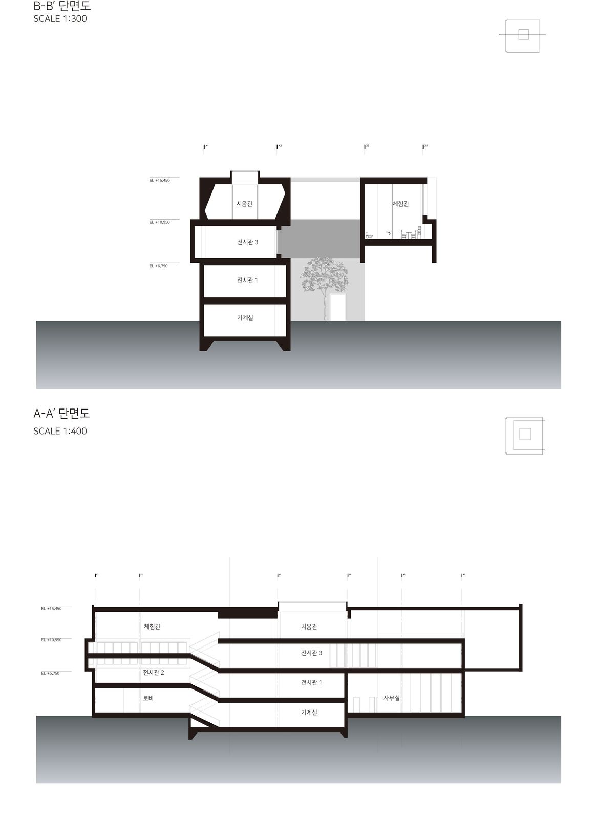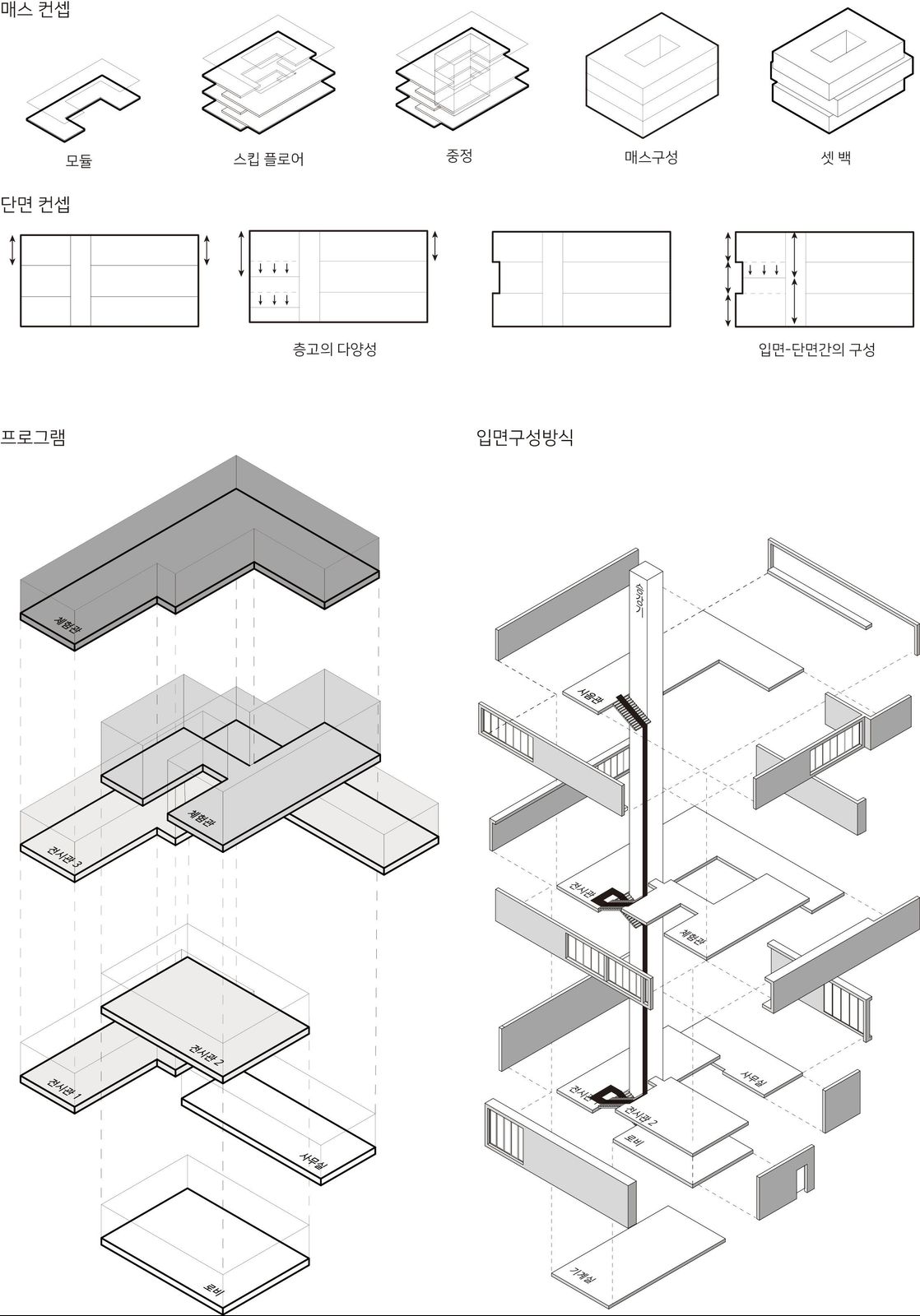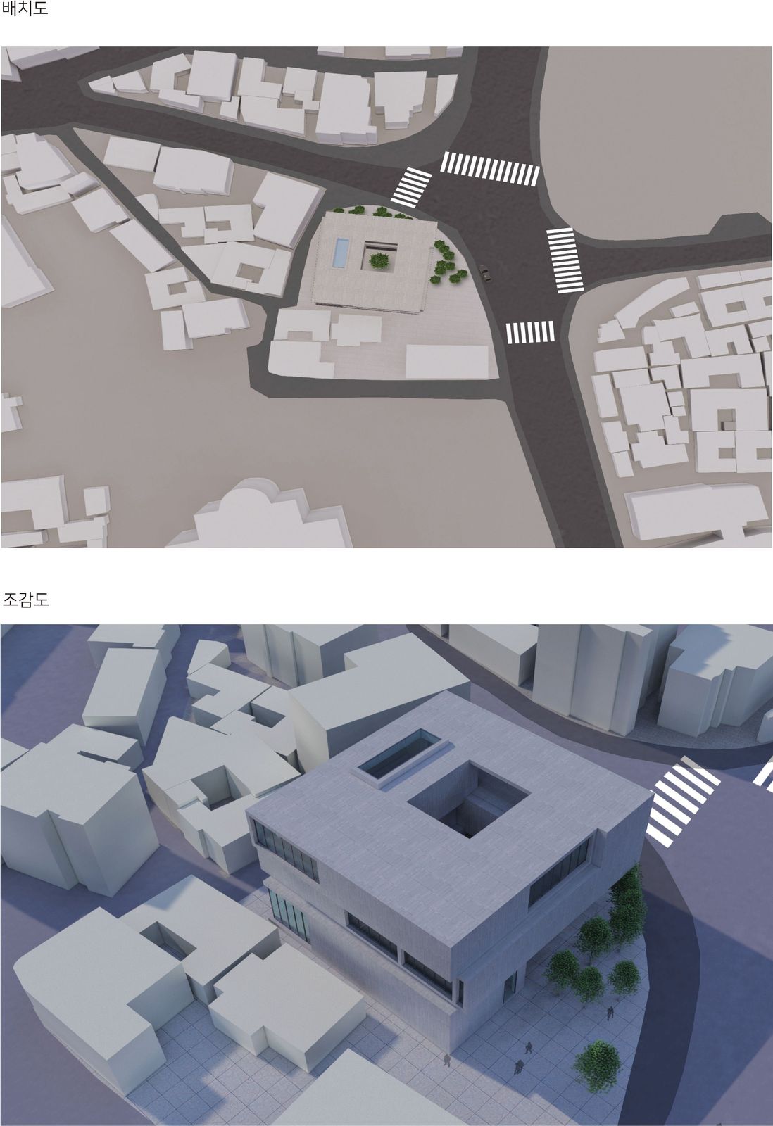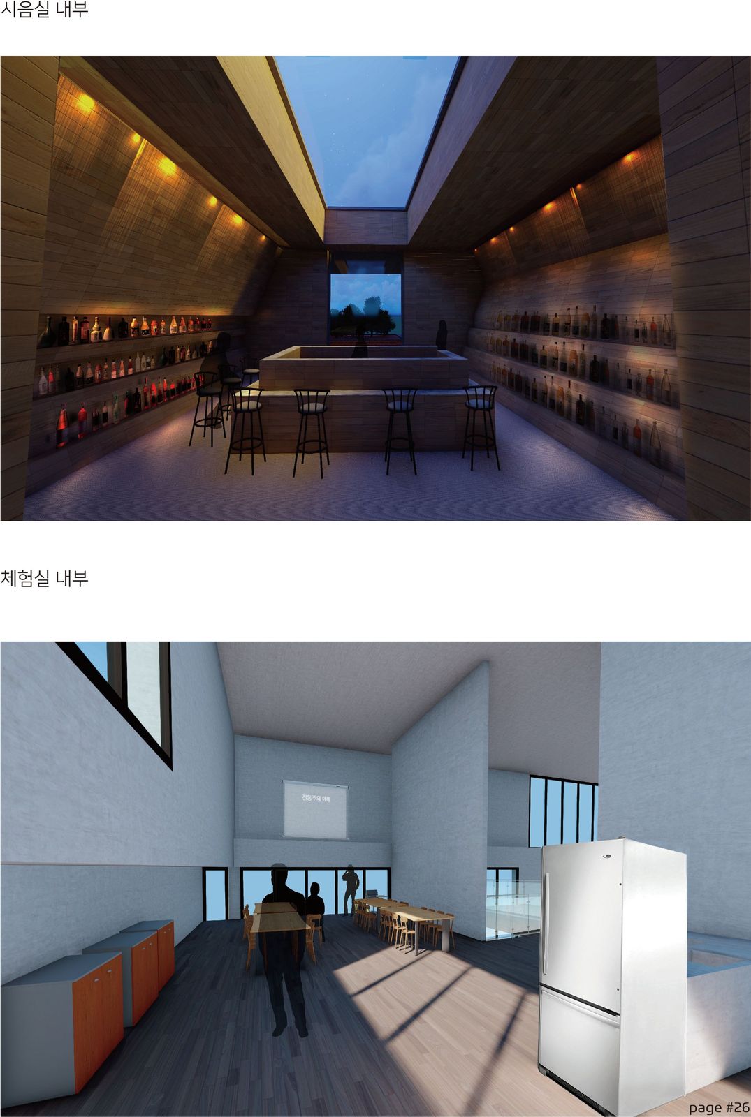 도시적 맥락은 크게 재료(벽돌의 분포), 한옥의 분포, 교통, 주변 갤러리, 총 네 가지로 분석하였다. 삼청동 – 재동일대의 가장 큰 특징은 한옥이 많이 분포하고 있다는 점이다. 이에 주변 한옥의 분포를 조사하고 건물의 기본 형태를 한옥의 ‘ㄷ’자 형을 본떠 만들었다. 또한, 벽돌을 매우 많이 볼 수 있어서 건물의 재료를 선정할 때 벽돌과 다른 재료를 사용하여 건물이 사이트의 랜드마크로 인식될 수 있도록 했다. 사이트 주변에 갤러리도 많이 있었는데 이 갤러리와 주제가 겹치지 않도록 하기위해서 용도를 조사했다. 주제가 명확한 전시관보다는 개인이 갖고 있는 갤러리나 작가들이 빌리는 갤러리들이 다수 있었다. 이에 주제가 명확한 전시관으로 설계하기로 했다. 갤러리의 주제는 전통주로 정했고 주제에 맞춰서 전시 – 체험 – 시음하는 프로그램을 구성했다. 선례분석에서 빛이 틈으로 떨어지는 것이 가장 인상깊어서 시음관에 천창을 뚫어 저녁에 달빛이 천창으로 들어오며 전통주를 시음할 수 있도록 했다.