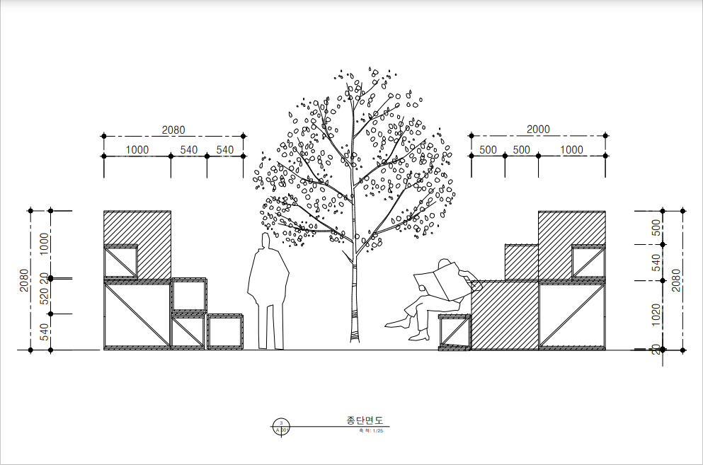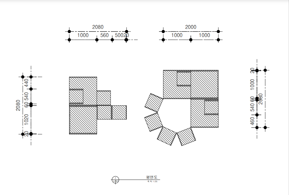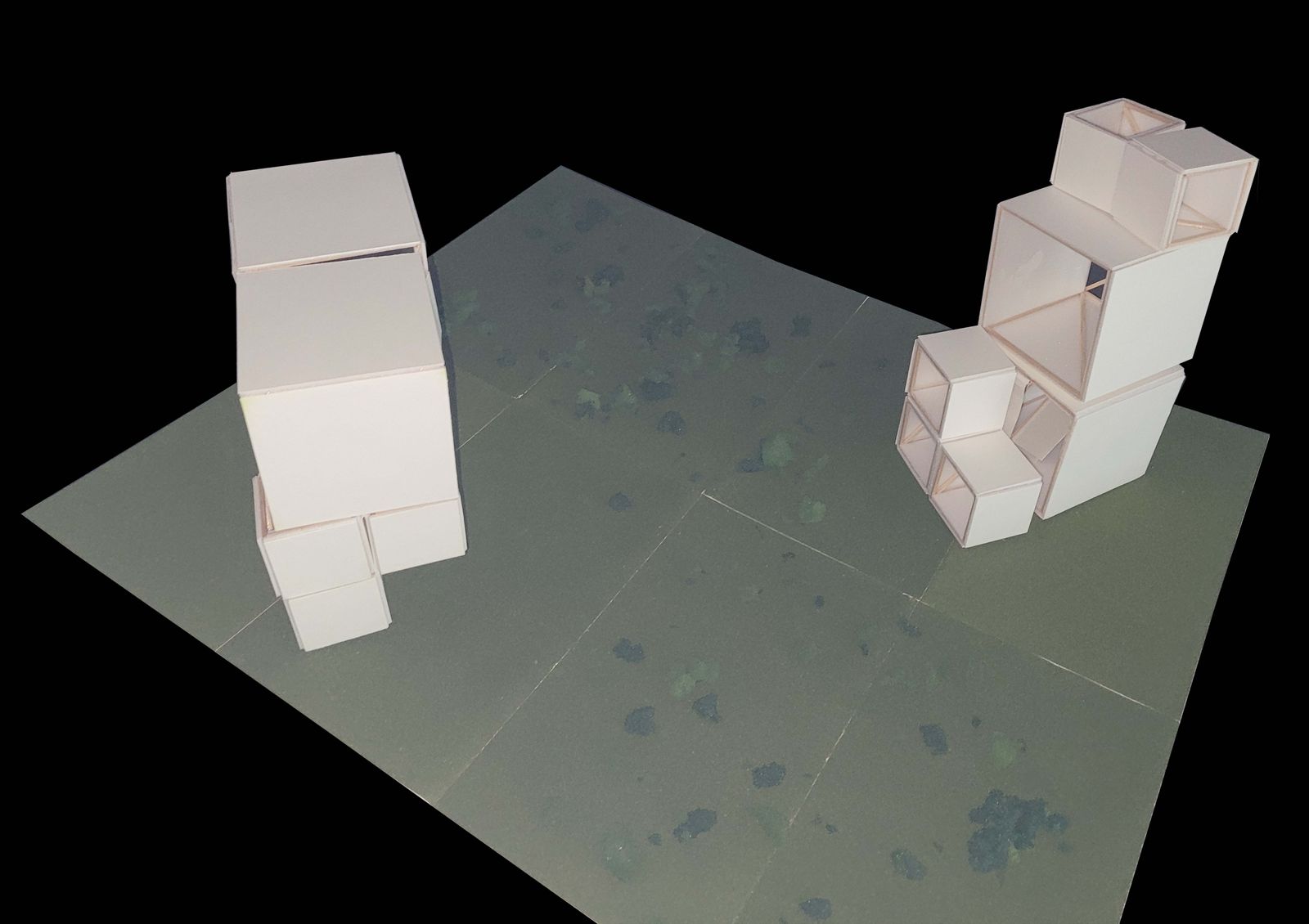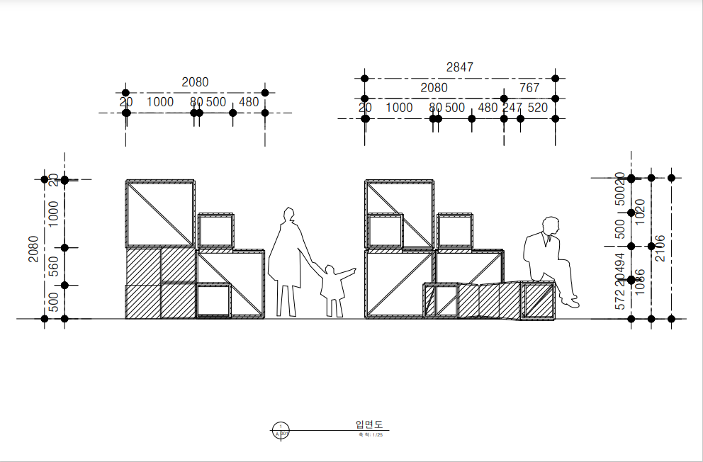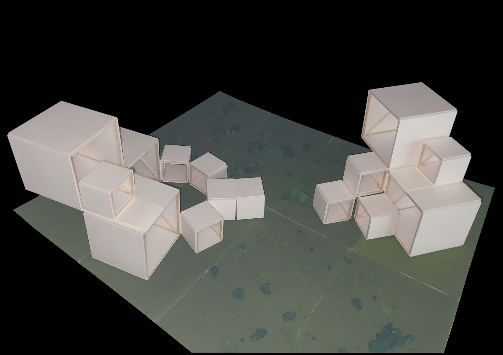 저는 변형 가능한 파빌리온을 만들고자 하였습니다. 그러나 파빌리온은 일종의 가건물인데 변형시킬 수 있을까하는 문제점에 봉착하였습니다. 파빌리온은 사람이 충분히 들어갈 수 있을 정도의 크기가 되어야 하지만 변형이 가능하기 위해서는 어느정도 크기가 작아야 했습니다. 따라서 저는 가볍고 간편한 부스형태의 파빌리온을 만들었습니다. 모형은 1:10비율로 만들었습니다. 기본 단위체는 2가지입니다. 첫 번째는 한 모서리의 길이가 50mm인 정육면체입니다. 성인의 무릎 높이로, 앉기에 적합하도록 만들었습니다. 중간을 비워놓아 선반으로도 충분히 이용할 수 있습니다. 두 번째는 한 모서리의 길이가 100mm인 정육면체입니다. 사람이 들어가서 앉았을 때 머리에 닿을락 말락한 높이입니다.