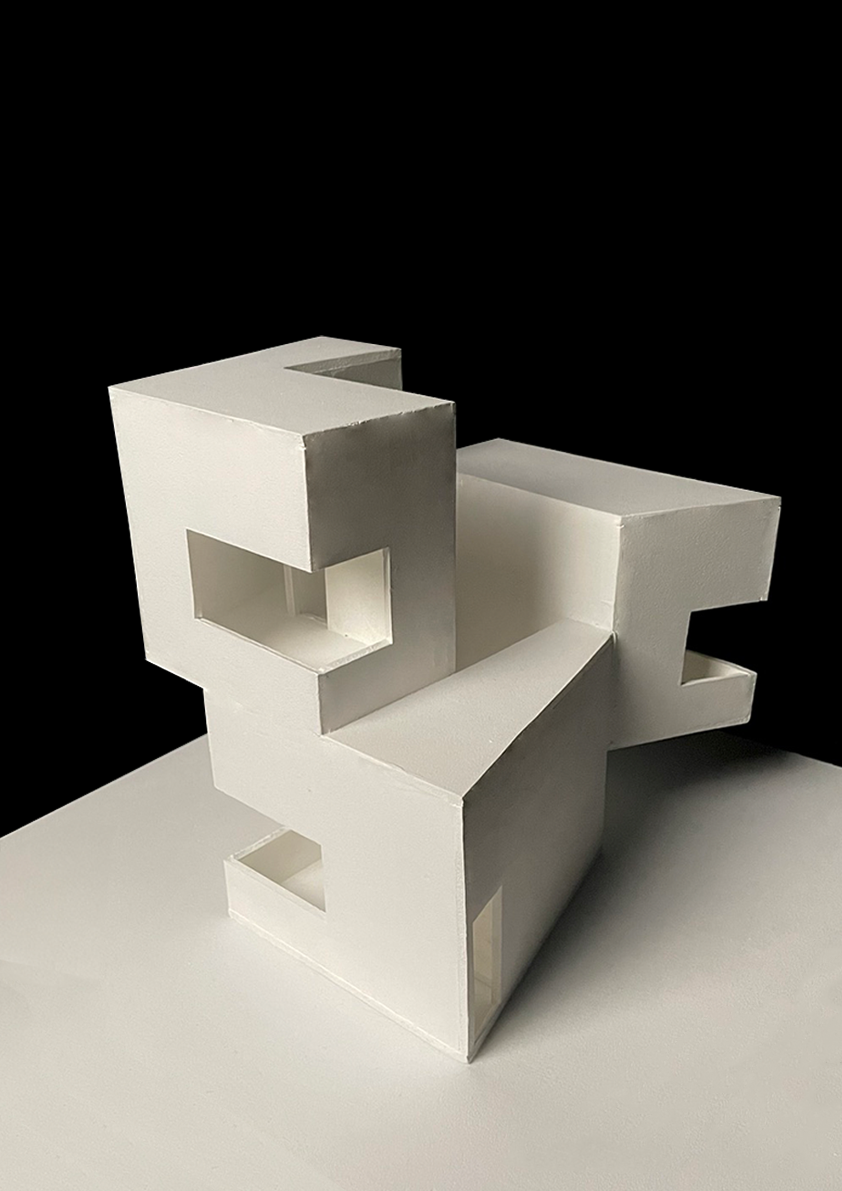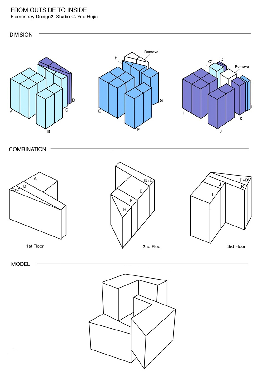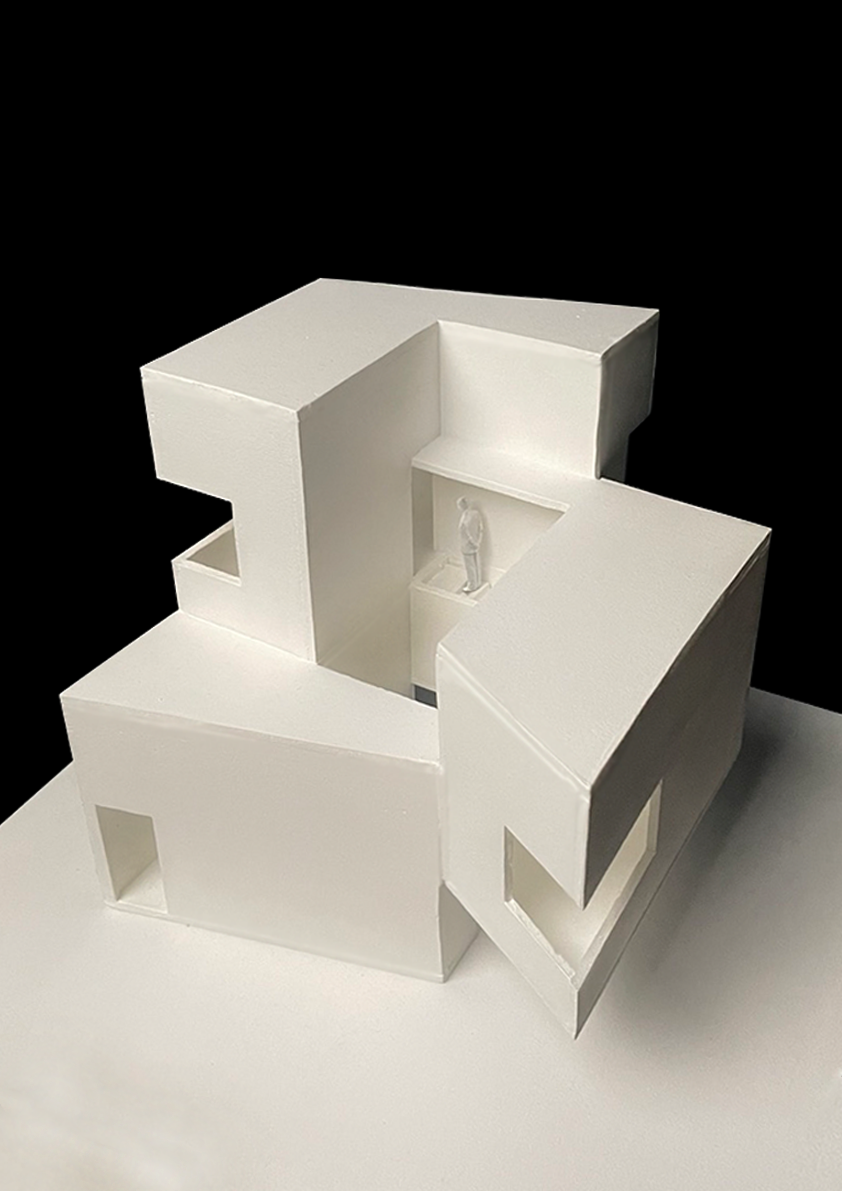 프로젝트를 처음 시작할 때, '밖에서 안으로'라는 다소 추상적인 주제를 내 나름대로 해석하는 데에 시간을 많이 썼다. 그렇게 떠올린 것이 세 개의 유닛으로 둘러싸인 중정이다. 중정은 분명 외부공간(밖)이지만, 건물로 둘러싸여 있기에 이용자에게는 내부(안)로도 인식될 수 있다. 중정은 그곳으로 들어오는 순간, 밖이라고 생각되었던 곳이 안으로 변화하는 공간인 것이다. 이 중정이 '밖에서 안으로'라는 주제를 잘 보여준다고 생각했고, 이 중정을 핵심으로 잡고 건물을 설계했다.