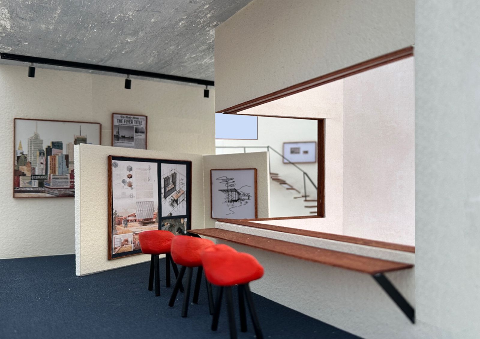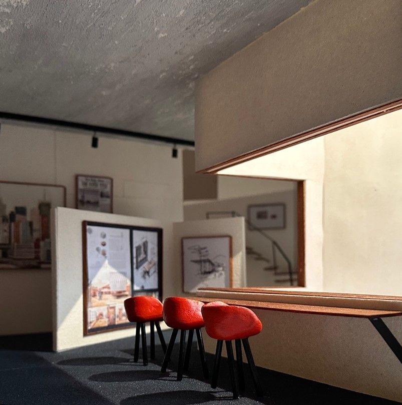 창틀은 벽과 바닥에 어울리는 마호가니 나무를 사용하였다. 통창 앞의 바 테이블 역시 마호가니 나무를 사용해 통일감을 주었다. 액자 프레임도 마호가니 나무를 사용해 전체적인 분위기와 맞추었다. 중간벽에 걸려있는 액자는 건축학과 전시를 예시로 들고 싶어 건축학과 설계 패널을 걸었다.