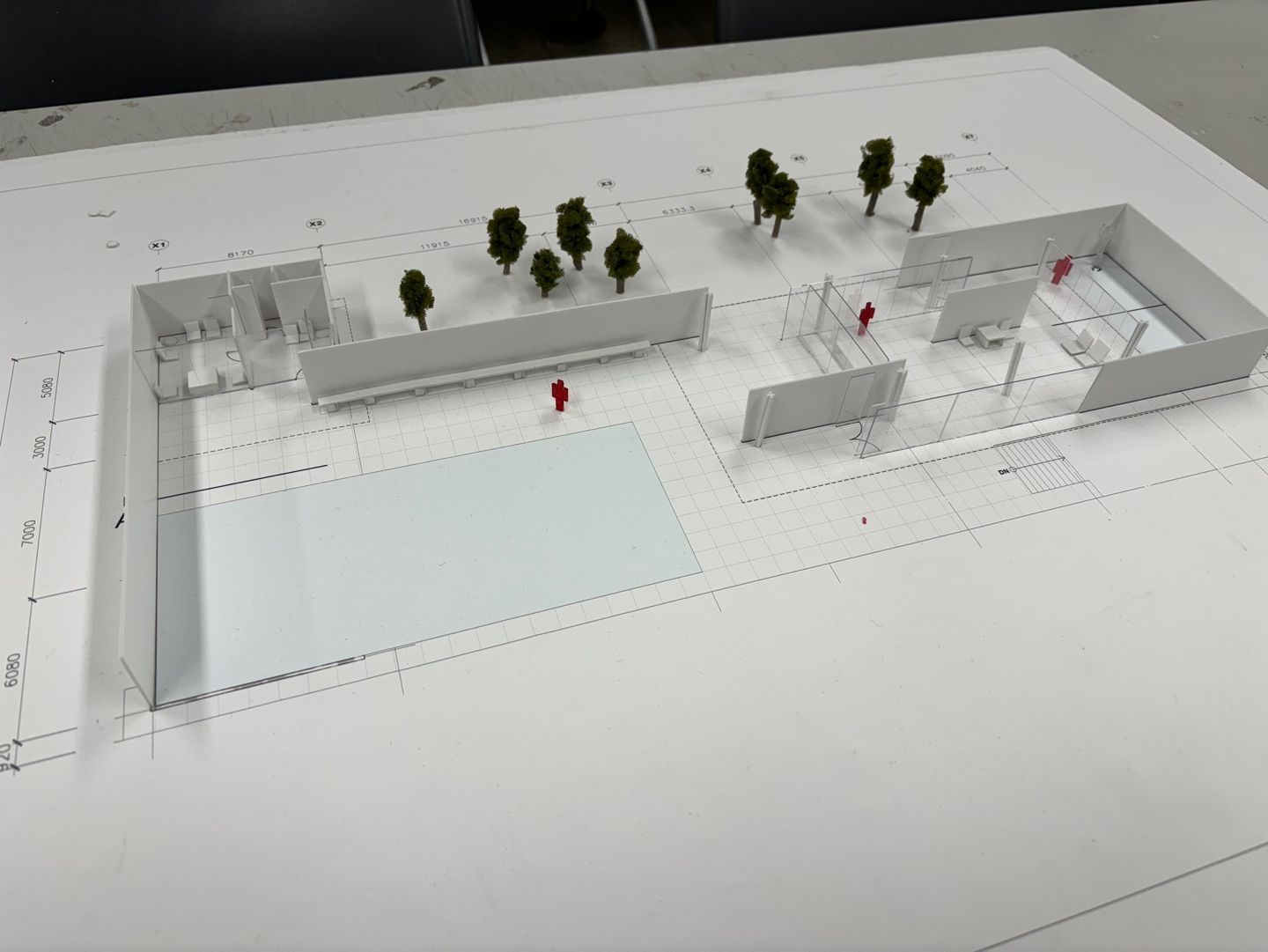 바르셀로나 파빌리온은 내외부 공간의 교차라는 개념을 매우 강력하게 선사한다. 당시의 사진 대개가 전시실에 있는 두 개소의 출입구 문을 모두 제거한 상태로 촬영되었다. 이로써 독자들은 마치 출입문 자체가 존재하지 않아 실내외의 구분이 원천적으로 불가능하다는 인상을 받게 된다. 게다가 대부분의 출판된 평면에도 출입문은 그려져 있지 않다. 또한, 전시실 안쪽의 수공간 위에 지붕이 덮이지 않았다는 점은 이곳이 외부임을 틀림없이 선사한다. 그러나 내부 전시실과 열린 벽 사이로 연통하니 내부이기도 하다. 내부이자 외부이며, 외부이자 내부인 공간적 특성을 찾을 수 있는 것이다. 나는 1:100모형 만들기를 통해, 파빌리온을 보면서 외부가 통유리로 마감되어 있는 것이 내외부의 경계를 흐리는데 한몫한다고 느꼈다. 또한, 1:1작도 활동을 하고난 뒤, 지붕이나 기둥 등 최소의 요소만으로 파빌리온이 제작되었다는 것이 무엇을 의미하는지 알 수 있었다.