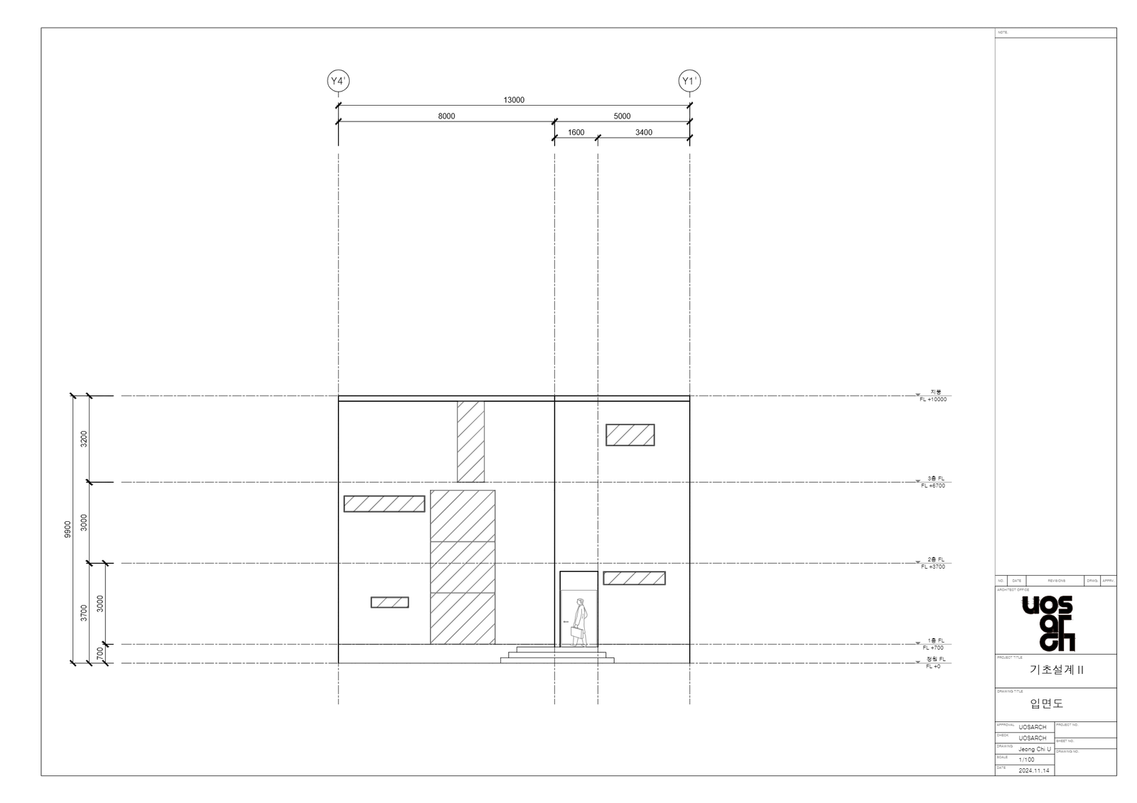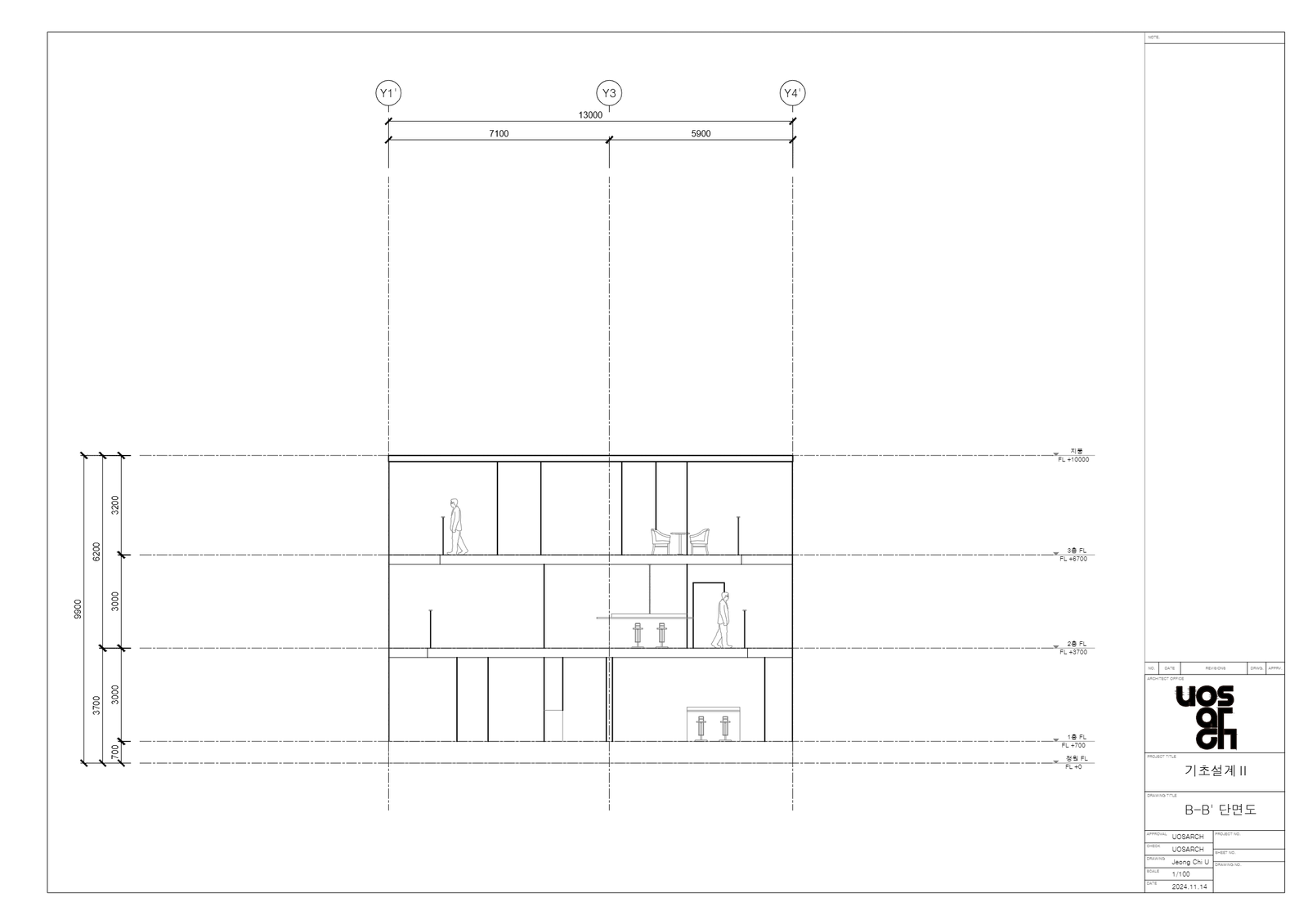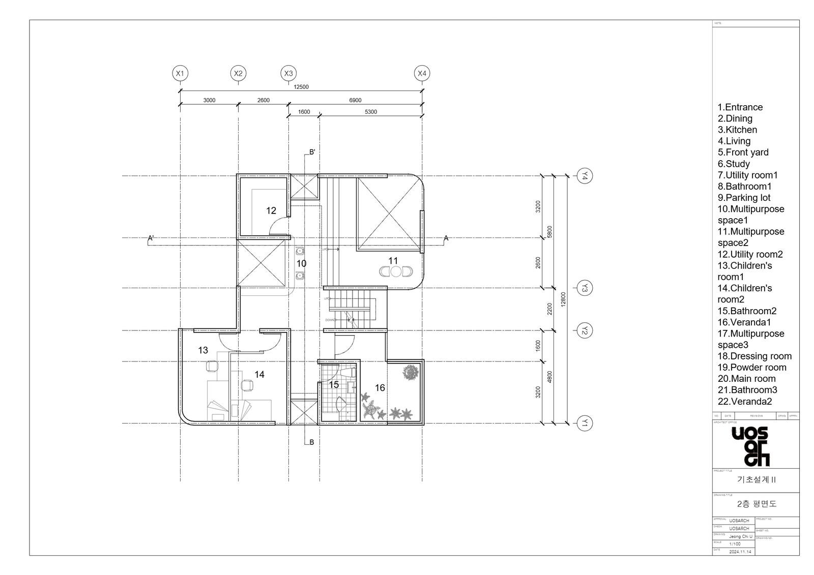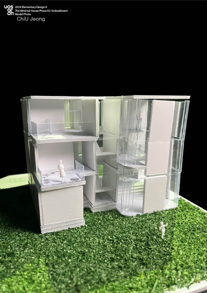 이 집은 도면 상의 'Y2' 혹은 'Y3' 축을 기준으로 위 쪽은 공용, 아래 쪽은 개인적 공간 특성을 가진다.중앙에 길에 나 있는 복도와 복도의 양 끝엔 통창이 있고 그 통창은 1층부터 3층까지 이어진다. 또한 마당에서 바라보는 집은 오픈되어있는것처럼 느껴지지만 반대쪽(도로쪽)에서 본 집은 개인적인 공간이라 느껴진다. 이것에는 '창'이 큰 역할을 한다. 마당 방향에는 창을 많이 두고 베란다 등 열려있는 공간이 많지만, 반대편에는 창을 아주 제한적으로 둘 뿐 아니라 입구 또한 계단을 두어 레벨을 높였기 때문이다. 이렇게 의도한 이유는 사이트의 특징과도 관련이 있는데 사이트의'B'구역은 두 면이 도로와 맞닿아 있고 도로의 건너에는 많은 사람들이 이용하는 공원이 위치해있기 때문에 프라이버시와 관련한 문제가 중요하다 생각했기 때문이다. 또한 창이 있는 부분의 반대편엔 똑같이 창을 내어 답답하다 느끼지 않게, 내부 공간이 넓게 보이게 하였다.