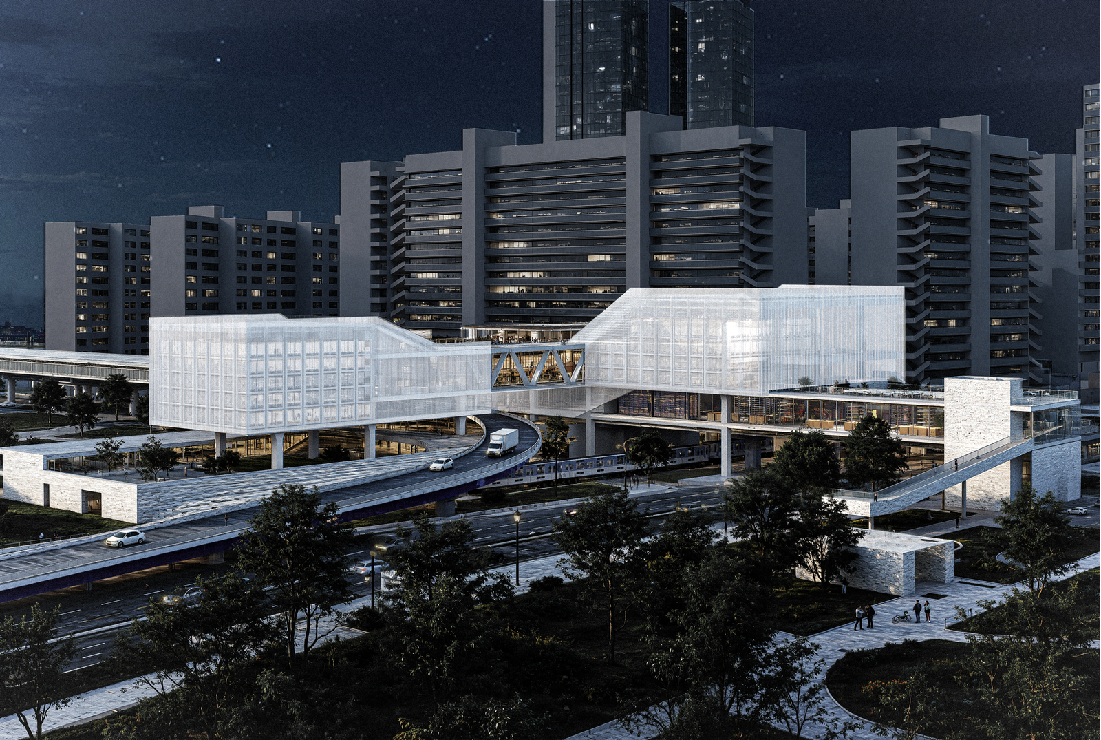 본 프로젝트는 이러한 단절된 인프라를 도시적 흐름 속으로 재편입시키고, 도심형 물류 시스템의 새로운 모델을 제안하는 데에 목적이 있다. 방치된 고가도로 구조를 입체적 물류 플랫폼으로 전환하여, 자동화 및 수직화를 기반으로 한 물류 흐름을 구축함과 동시에, 공공성과 상업성이 융합된 복합 프로그램을 도입한다. 이를 통해 물류 기능의 도시 내 통합뿐 아니라, 지역 주민을 위한 공공 자원의 확장, 그리고 도시 연결성의 회복을 도모한다.