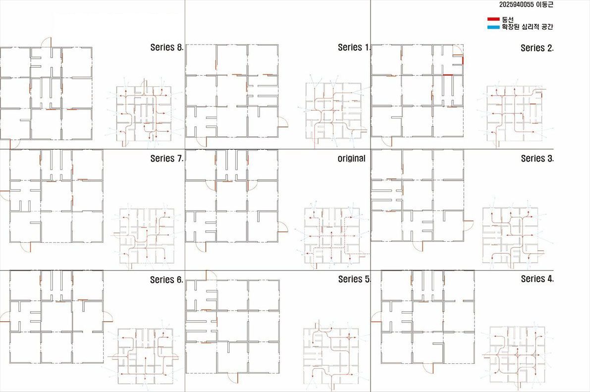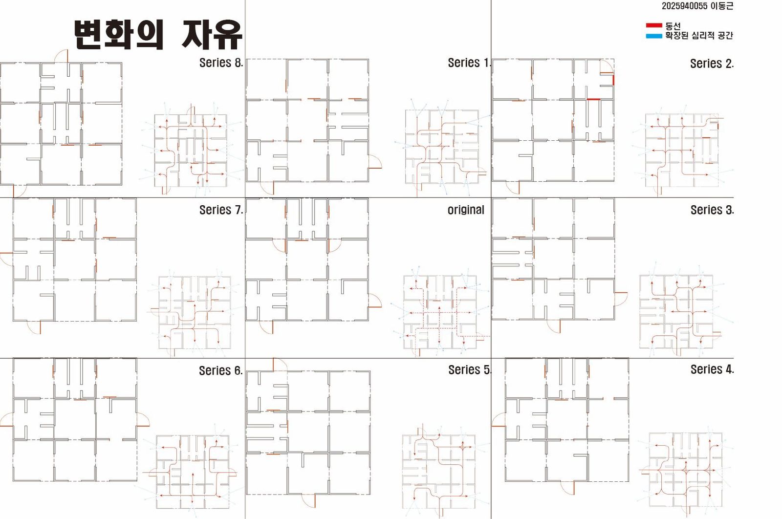 이 과제를 진행하면서 방의 배치를 변경하는 것이 어떤 장점이 있는지 고민했었는데, 패널에서 각각의 방의 배치의 동선을 표현해보고, 패널에는 표현하지 못했지만, 채광에 대해서도 고민해보면서 방의 배치를 변경하면서 생기는 방의 분위기의 변화가 이 집의 장점이 될 수 있겠다는 생각이 들었고, 거주자의 선택에 따라 구성된 방의 프로그램이 각각 전혀 다른 느낌을 줄 수 있겠다는 생각이 들었다.