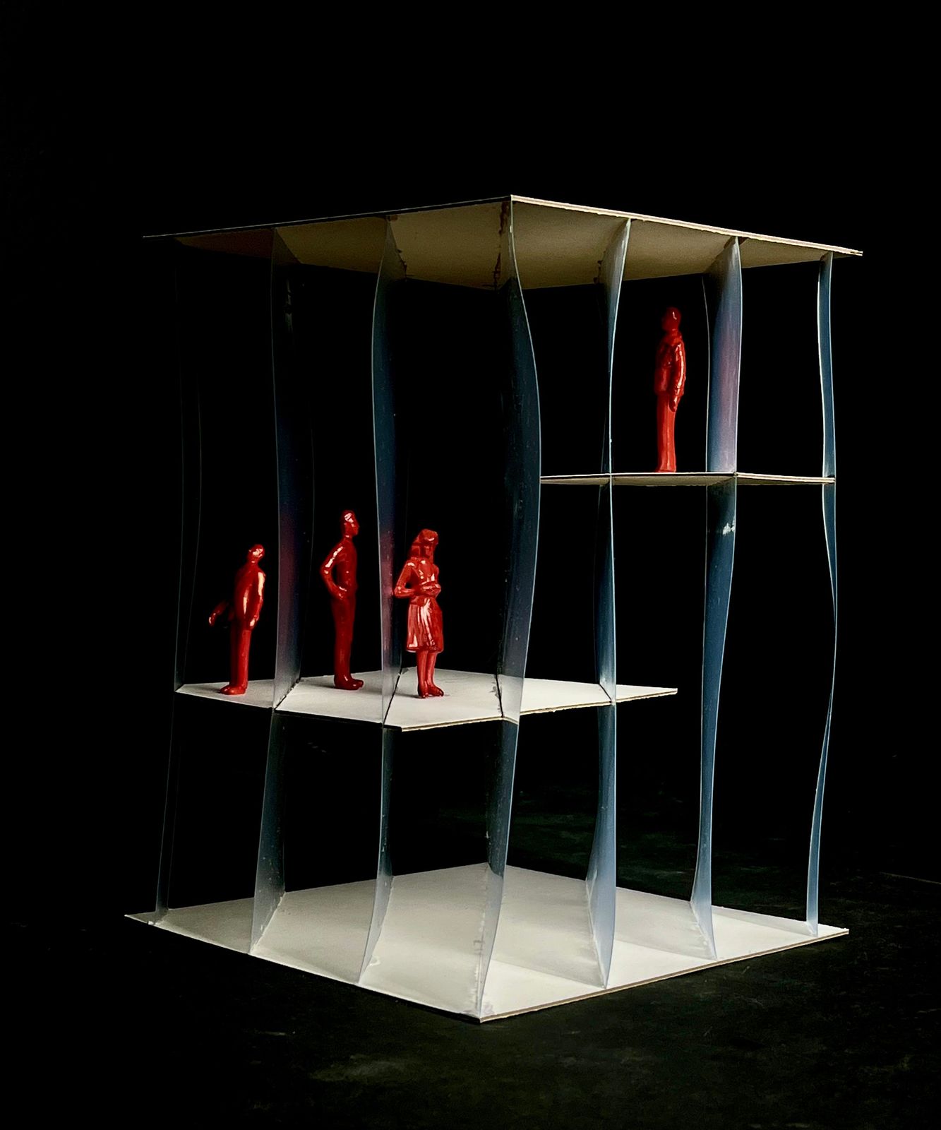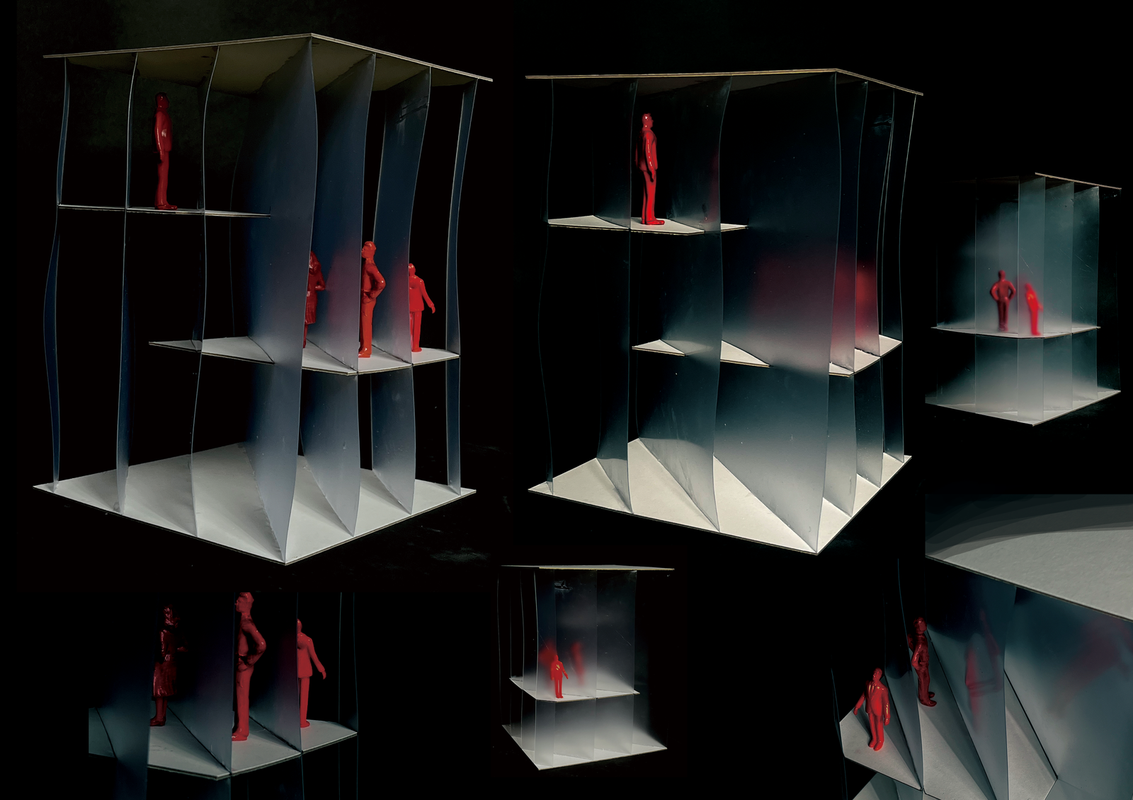 그래서 실제로는 보이지 않는 레이어를 시각화하고, 직접 슬라브를 레이어 속에 넣어보았다. 슬라브의 높이 조절로 공간의 상대성을 표현하고 돌릴 때마다 변화하는 슬라브의 단면, 레이어의 기울기 그리고 서 있는 사람의 투명도가 달라지는 것을 확인할 수 있도록 했다.
