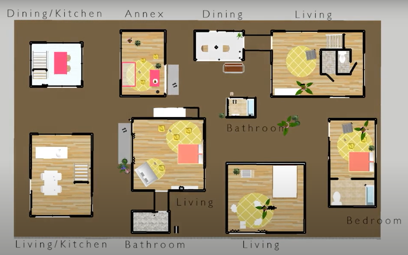 두 번째, 기능이 분리되어 있다. 어떤 건물에는 화장실, 주방, 침실 등 주거에 필요한 기능들이 모두 포함되어 있지만, 몇 곳은 기능이 분리되어 있는 형태를 가진다.