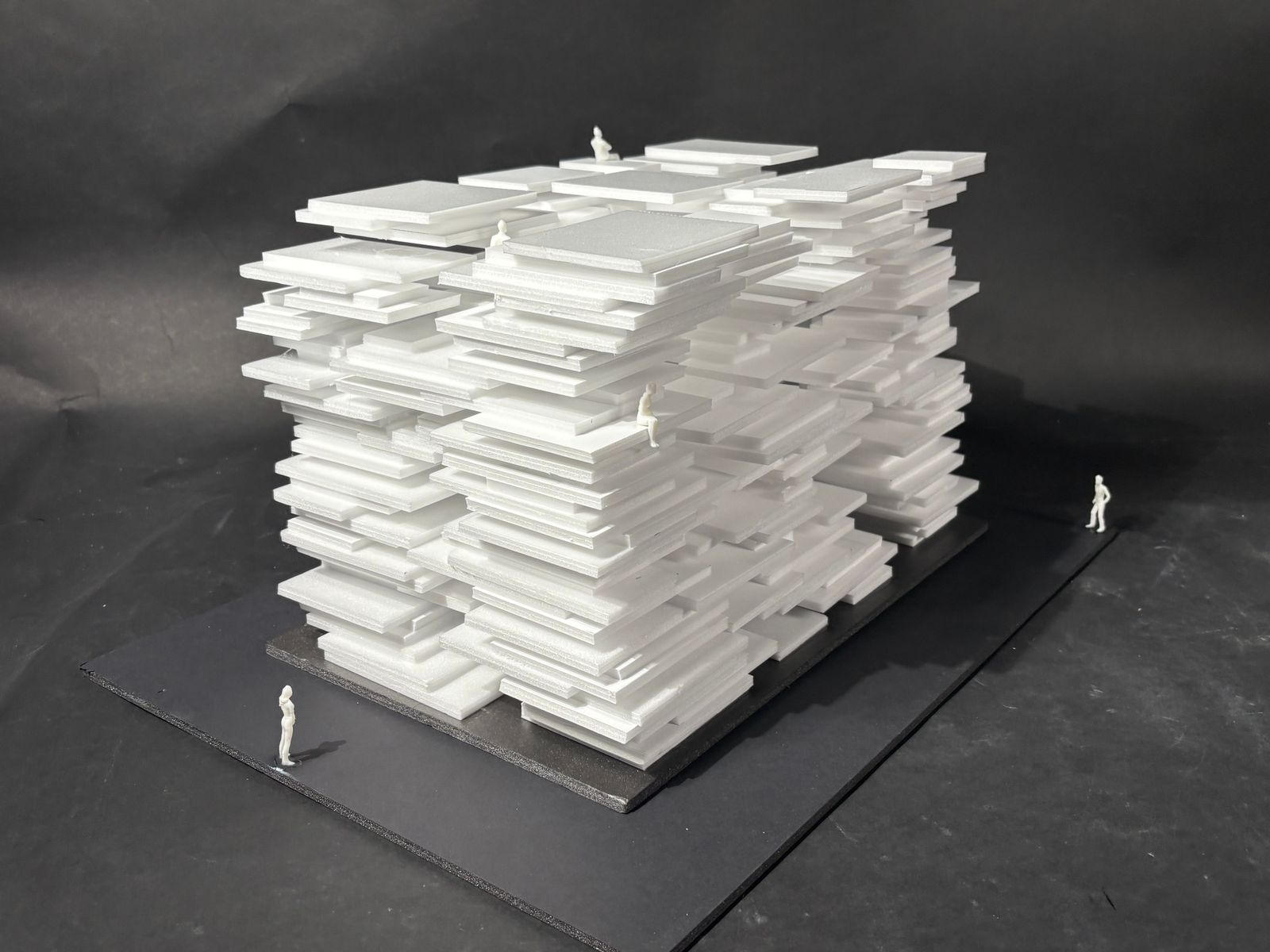트레이싱한 40개의 배치는 어두운 부분과 밝은 부분 그리고 회색 부분으로 나눠진다. 그 중 어두운 부분은 건물이 들어설 가능성이 높은 곳, 밝은 부분은 건물이 들어서지 않을 가능성이 높은 곳, 마지막으로 회색 부분은 사이공간이 된다. 사이공간은 마당이 될 수도, 정원이 될 수도, 이웃과 소통의 공간이 될 수도 있다. 이렇게 어두운 정도를 0부터 100까지 수치를 각각 부여하여 숫자가 클수록 큰 Z축 값을 주어 3D모델을 만들었다.