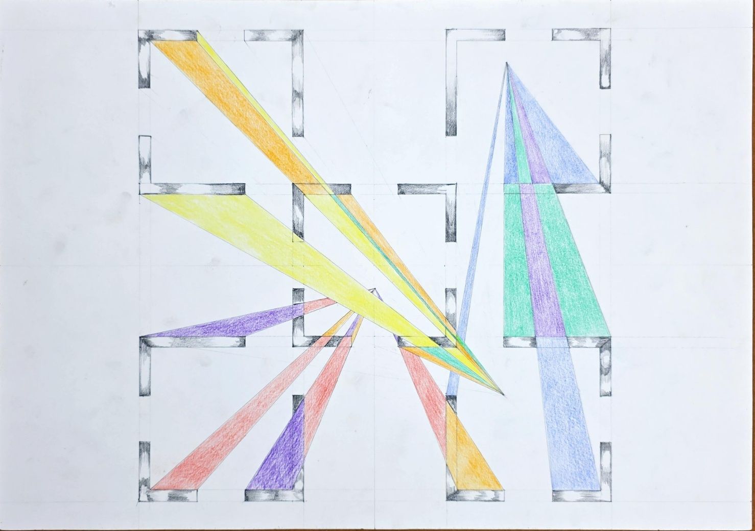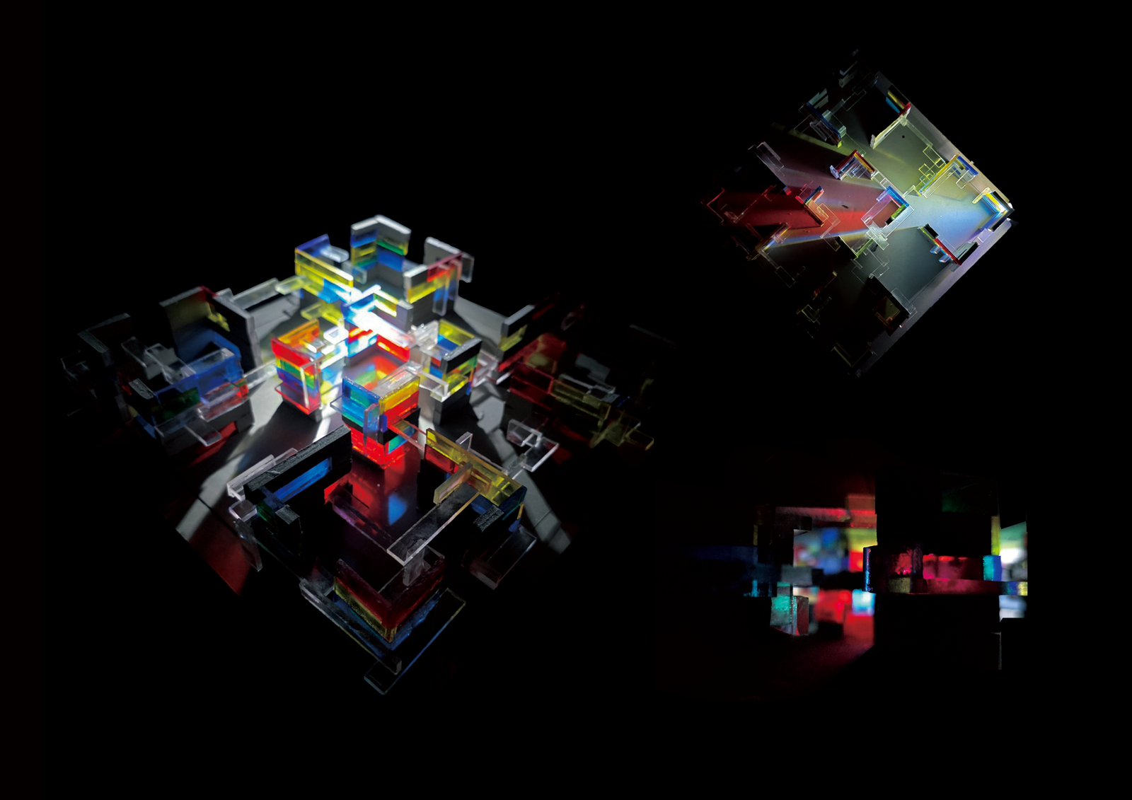 빛이 한 방향에서 모형을 비춘다면 폼보드로 막힌 부분은 검은 그림자를, 아크릴로 막힌 부분은 색이 있는 그림자를 바닥에, 그리고 투명 아크릴에 비출 것이다.