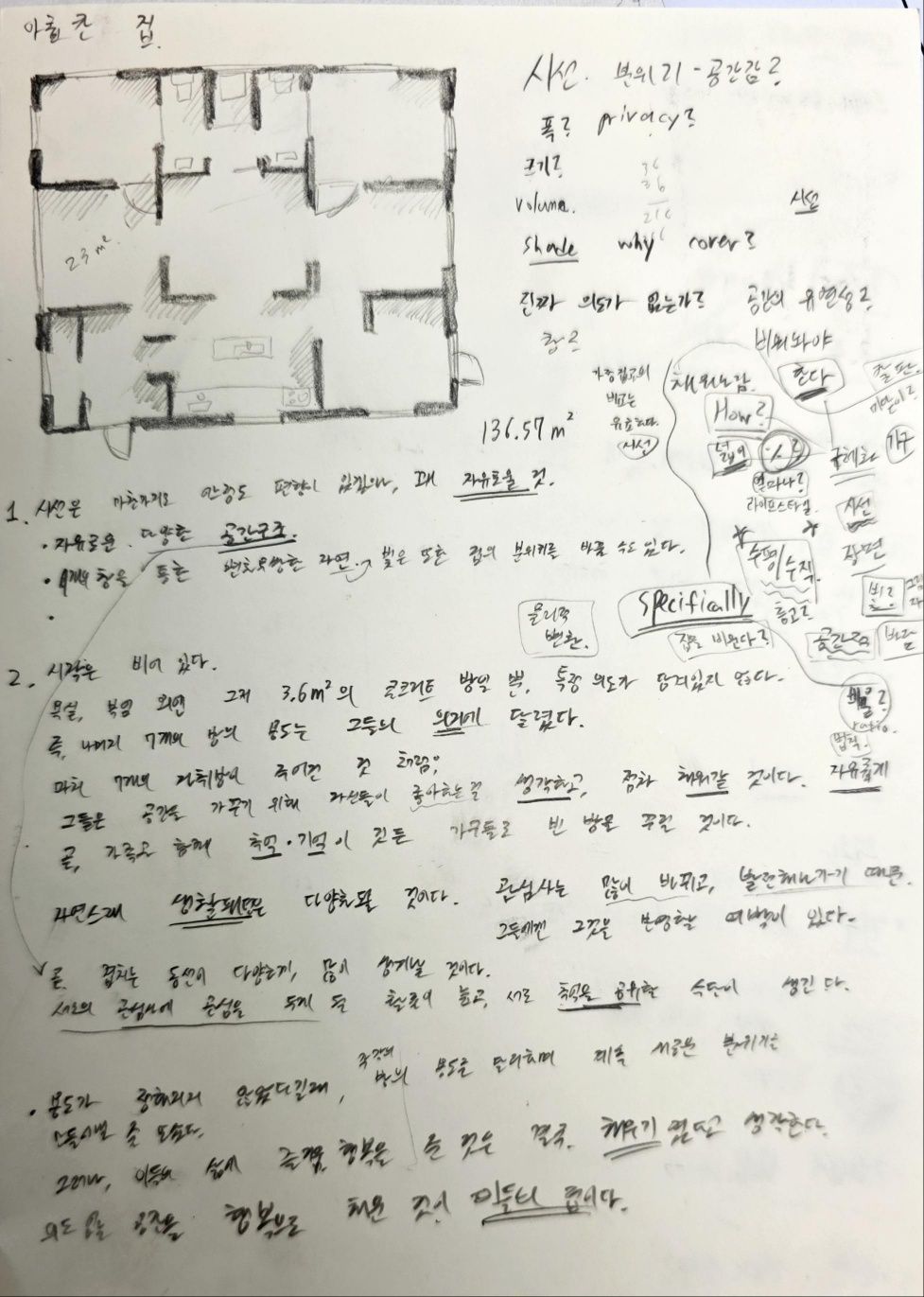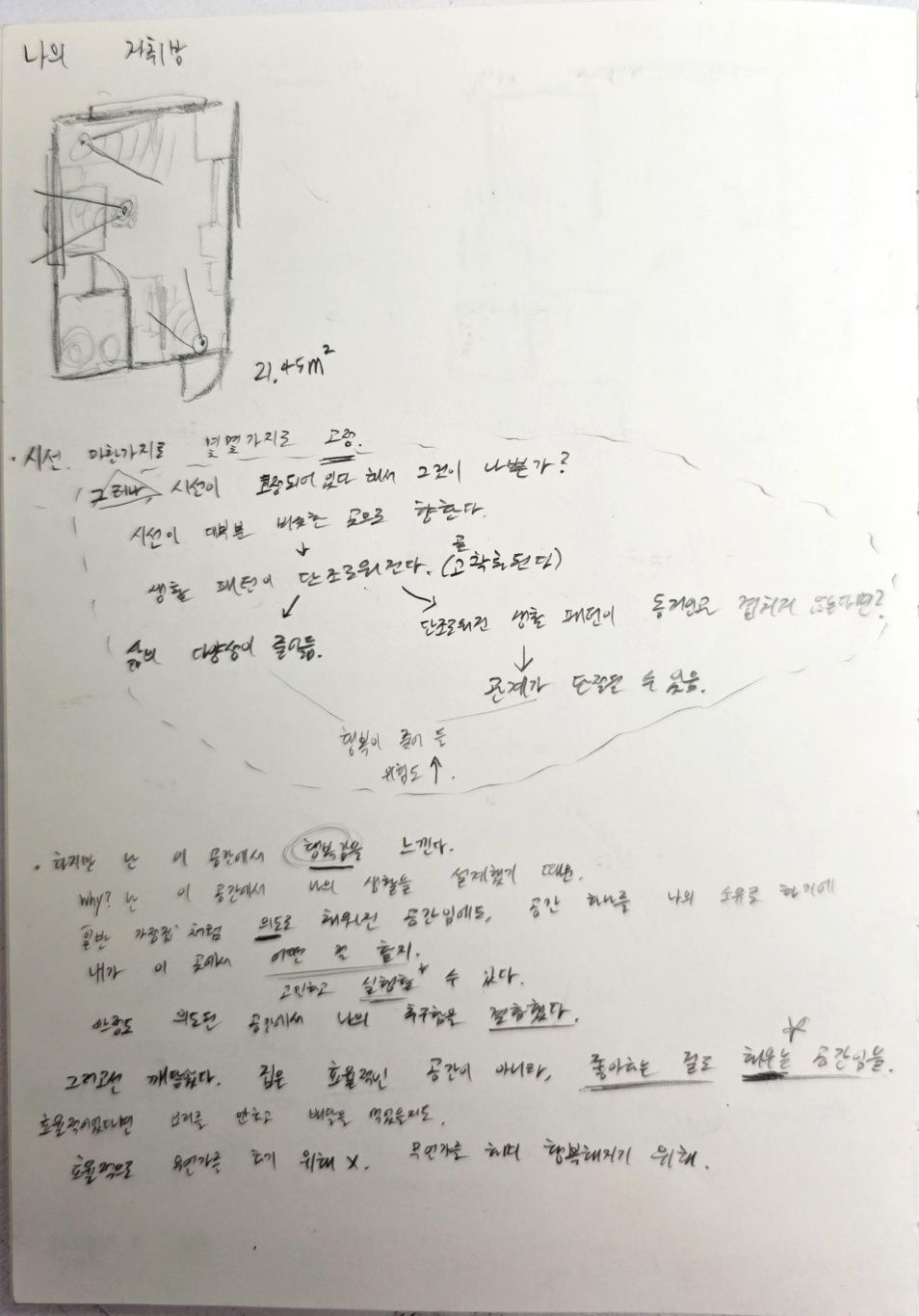 이를 알아보기 위해 공간의 특성, 그것이 사람에게 주는 인식, 나아가 그것이 행복과 어떻게 연관되는가를 중점적으로 나의 본가(3인가구), 나의 자취방(혼자), 그리고 아홉칸 집(4인가구)을 나/에이리가족의 관점에서 분석하였다.