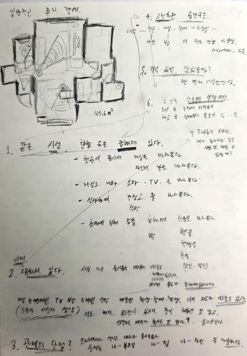 표준적인 3~4인가족이 가질 것으로 예상되는 생활양식을 반영한 본가의 평면구조는 집에 들어설 때부터 이미 채워져 있다. 이는 하나의 공간에서 보이는 광경에서도 드러난다. 현관에서 보이는 광경, 침실에서 보이는 광경 등은 그 자체로 무언가를 의도한다. 마치 이곳에 티브이를 두고 저기엔 소파를 두라는 식으로. 시선이 반강제적으로 행동과 생활양식을 제시하는 것이다. 방의 구조에서도 이는 드러난다. 다른 공간으로 통하는 개구부는 한두개에 불과하며, 이는 행동의 반경마저 하나의 방으로 제한하는 듯한 인상을 준다. 사람들은 대개 시선이 열린 공간으로 이동하기 때문이다. 이 속에서 우리 가족은 우리 마음대로 공간을 채울 수 있었을까?