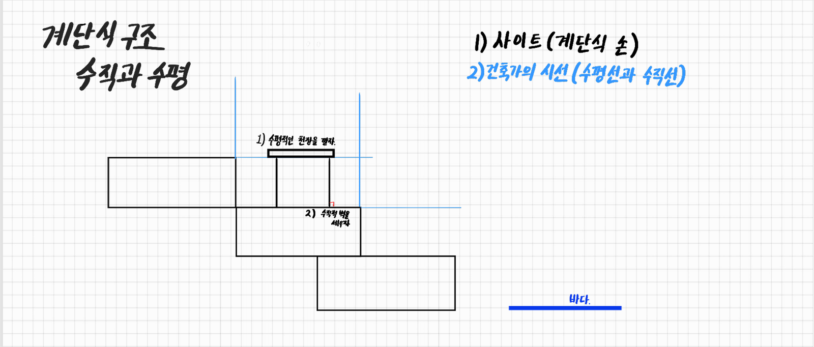 먼저 원본의 테라스 위에 놓인 유리 파사드를 생각하면 정면을 보았을때 테라스와 바다가