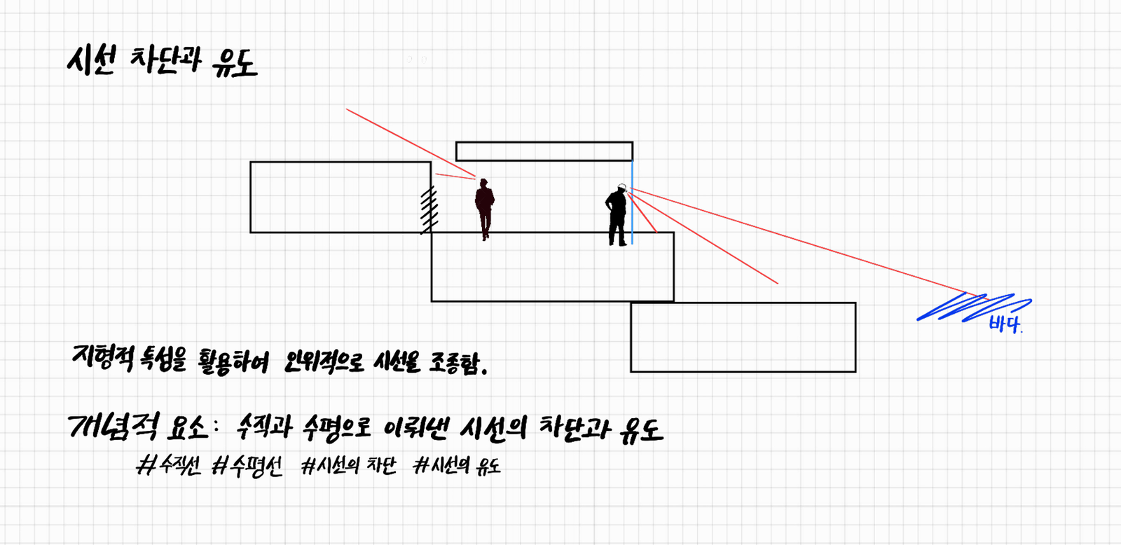 단순한 생각으로는 계단식이니까 "위까지 가려서 지형적 통일성을 강조하자" 할 수 있지만 자연스레 뒷부분을 열어 빛이 들어오게 했다.
