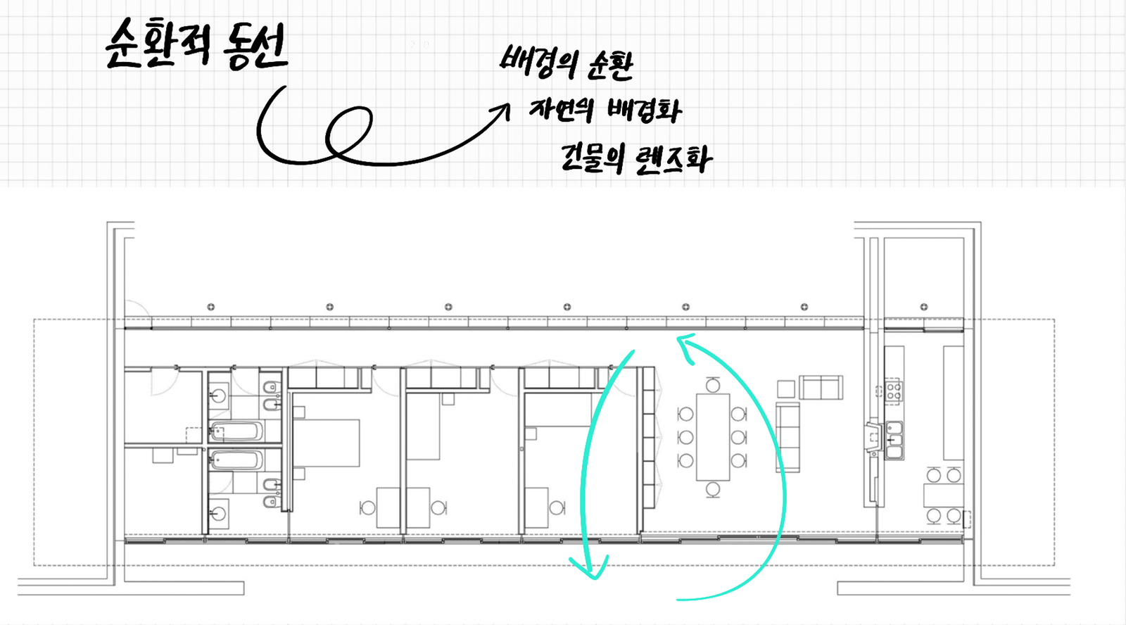 복도 -> 거실 -> 복도 -> 방으로 이어지는 순환적인 동선을 표현했다.