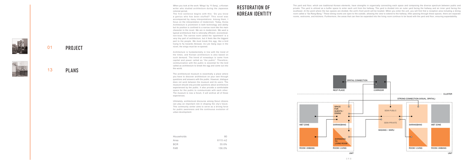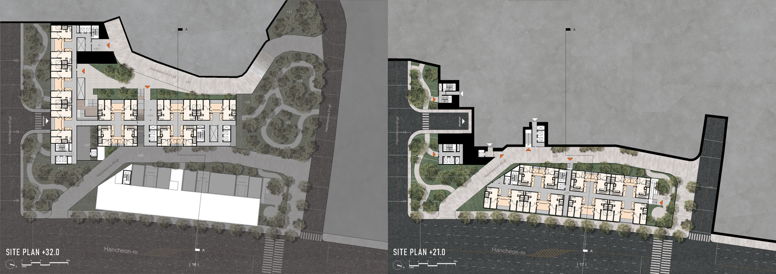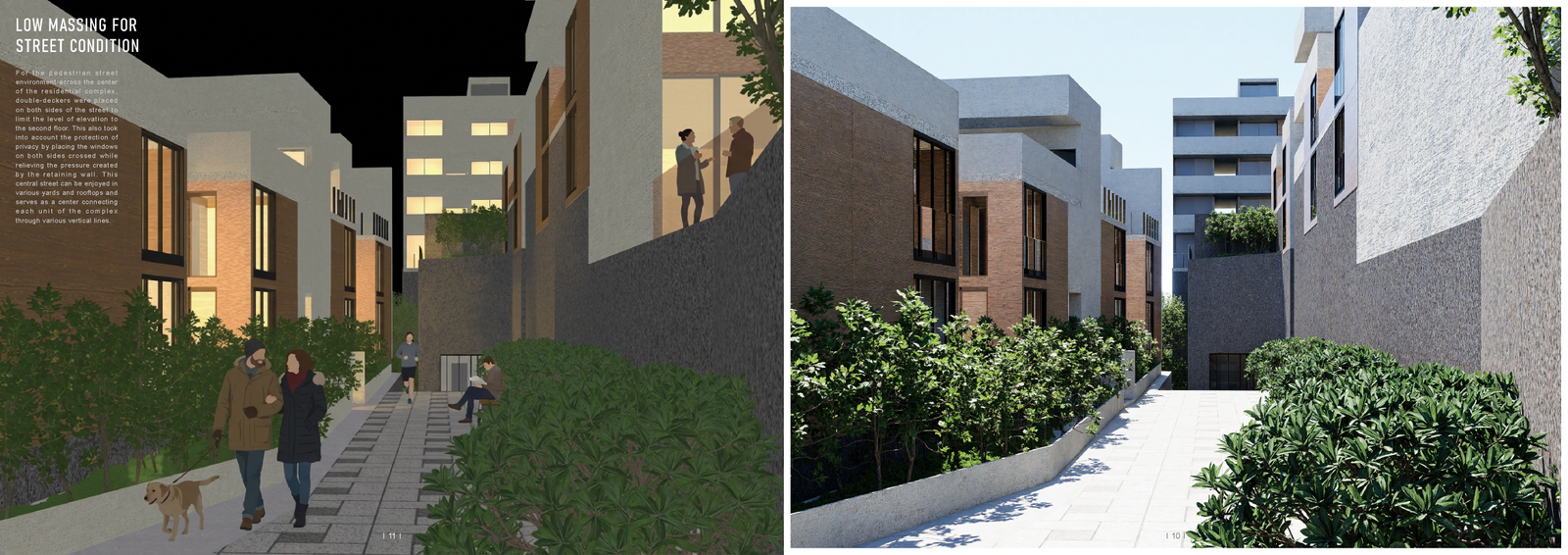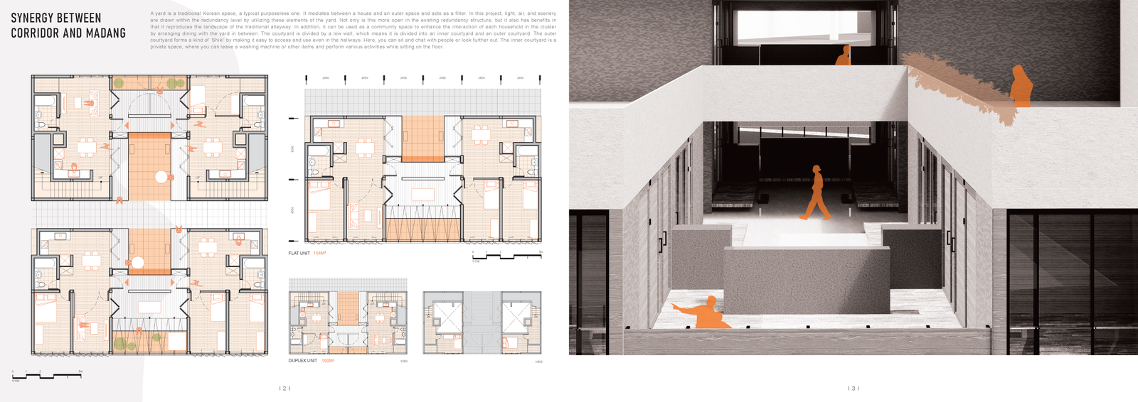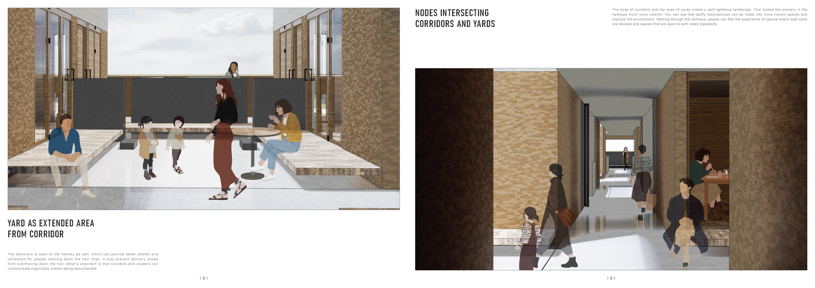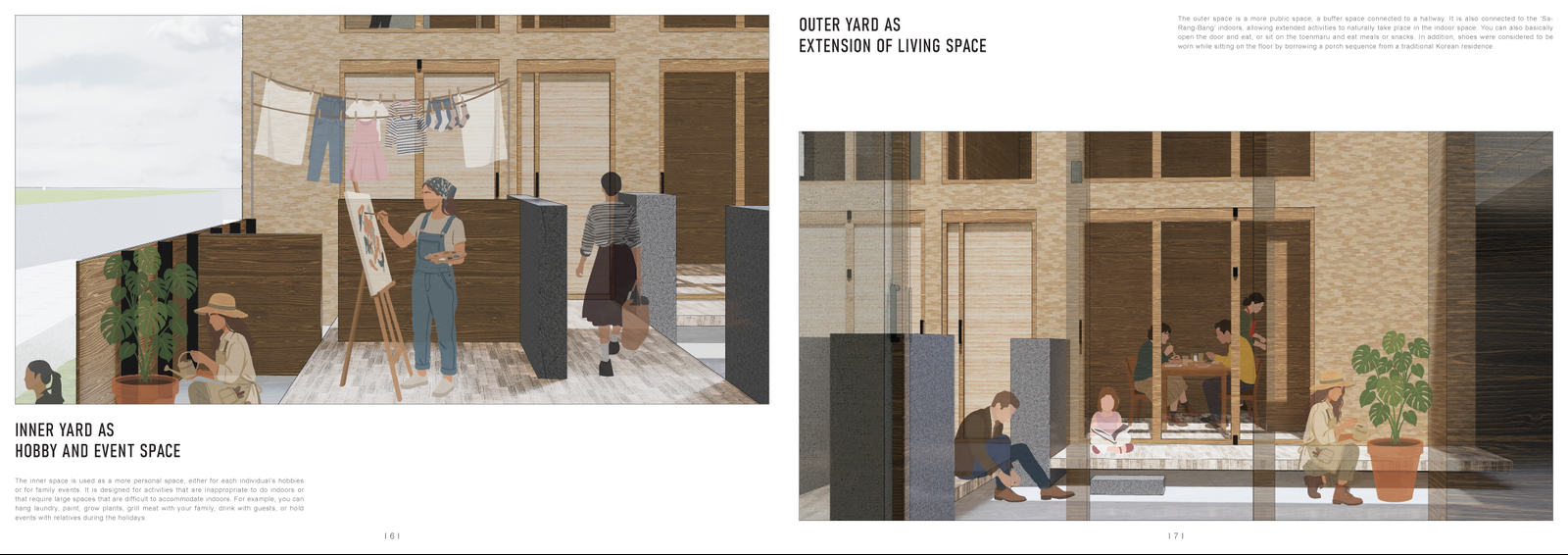 A yard is a traditional Korean space, a typical purposeless one. It mediates between a house and an outer space and acts as a filter. In this project, light, air, and scenery are drawn within the redundancy level by utilizing these elements of the yard. Not only is this more open in the existing redundancy structure, but it also has benefits in that it reproduces the landscape of the traditional alleyway. In addition, it can be used as a community space to enhance the interaction of each household in the cluster by arranging dining with the yard in between. The courtyard is divided by a low wall, which means it is divided into an inner courtyard and an outer courtyard. The outer courtyard forms a kind of ‘Shiki’ by making it easy to access and use even in the hallways. Here, you can sit and chat with people or look further out. The inner courtyard is a private space, where you can leave a washing machine or other items and perform various activities while sitting on the floor.