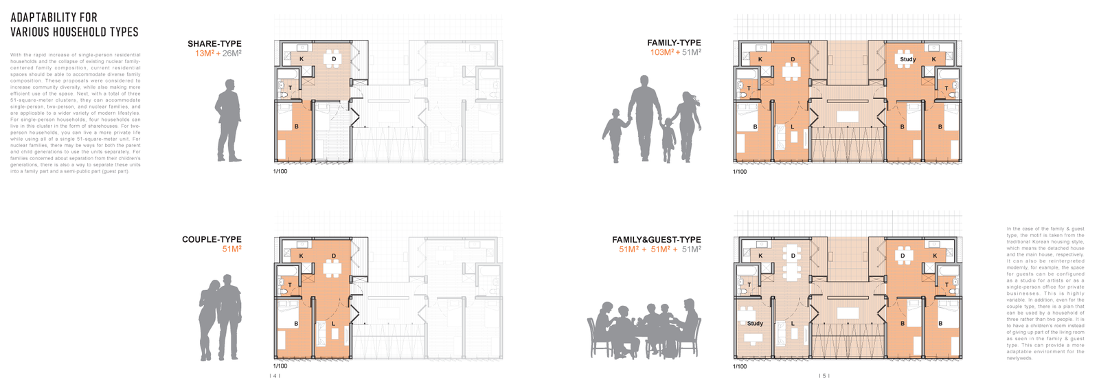 With the rapid increase of single-person residential households and the collapse of existing nuclear family-centered family composition, current residential spaces should be able to accommodate diverse family composition. These proposals were considered to increase community diversity, while also making more efficient use of the space. Next, with a total of three 51-square-meter clusters, they can accommodate single-person, two-person, and nuclear families, and are applicable to a wider variety of modern lifestyles. For single-person households, four households can live in this cluster in the form of sharehouses. For two-person households, you can live a more private life while using all of a single 51-square-meter unit. For nuclear families, there may be ways for both the parent and child generations to use the units separately. For families concerned about separation from their children’s generations, there is also a way to separate these units into a family part and a semi-public part (guest part).