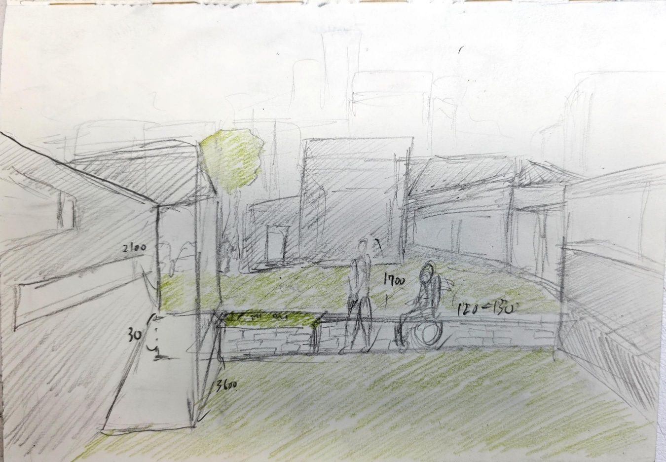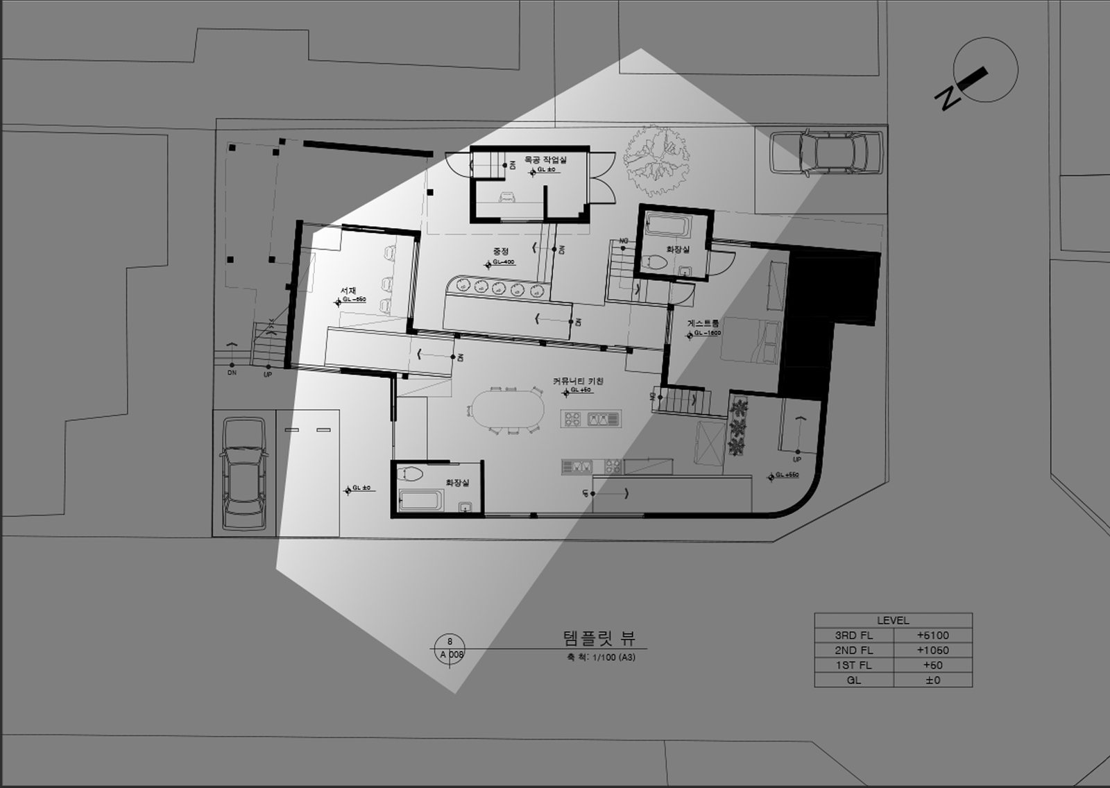 정한 장면은 과제2를 하며 가장 신경썼던 장면이다. 지면으로부터 400정도 낮은 높이의 서재에서 중정과 커뮤니티 키친, 그리고 하늘을 바라보는 장면. 도로와 주변 고층건물 등의 스트레스는 최대한 걷어내고 보고싶은 것만을 볼 수 있도록 의도한 것이다.