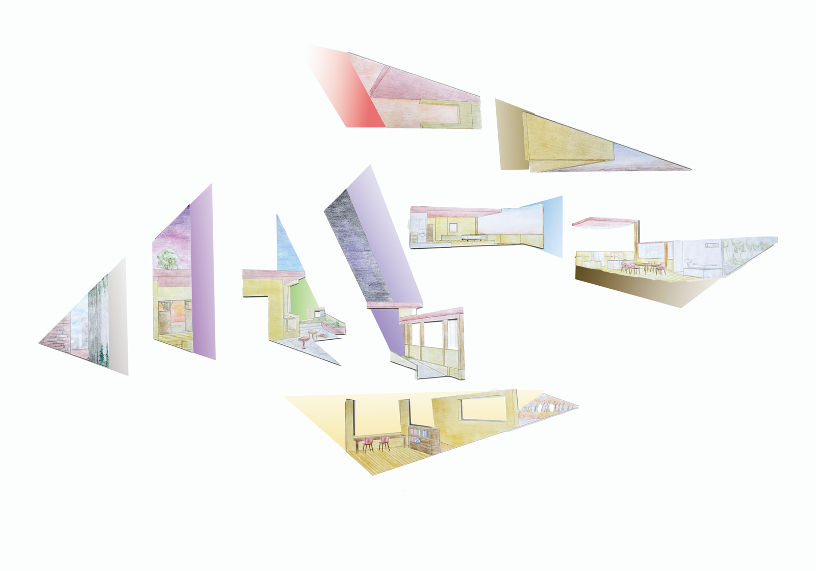 이 주택의 정주인원 중 한 명이 특정 순간에 특정한 한 장면을 바라보며 이 주택에서의 여러 장면을 기억하는 방식을 표현해보고자 했다.
