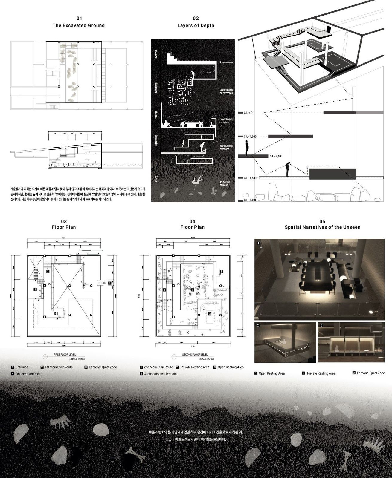 Beneath the Sewoon Sangga complex, the remains of Buildings No. 3–5 from the early Joseon period contain layers of time that are revealed only by descending downward—unlike the city above, which has expanded solely upward. The fragmented structures and traces of materials testify that past orders still persist within the present, quietly exposing the depth inherent in subterranean space. In contrast to the ground level, dominated by noise and constant movement, the underground becomes a slow space where one can confront accumulated time. This rereading of stratification goes beyond preservation; it is a process of building new experiences upon a historical foundation. We seek to transform this lower realm into a contemplative space beneath the city—a place to dwell and to reflect.
