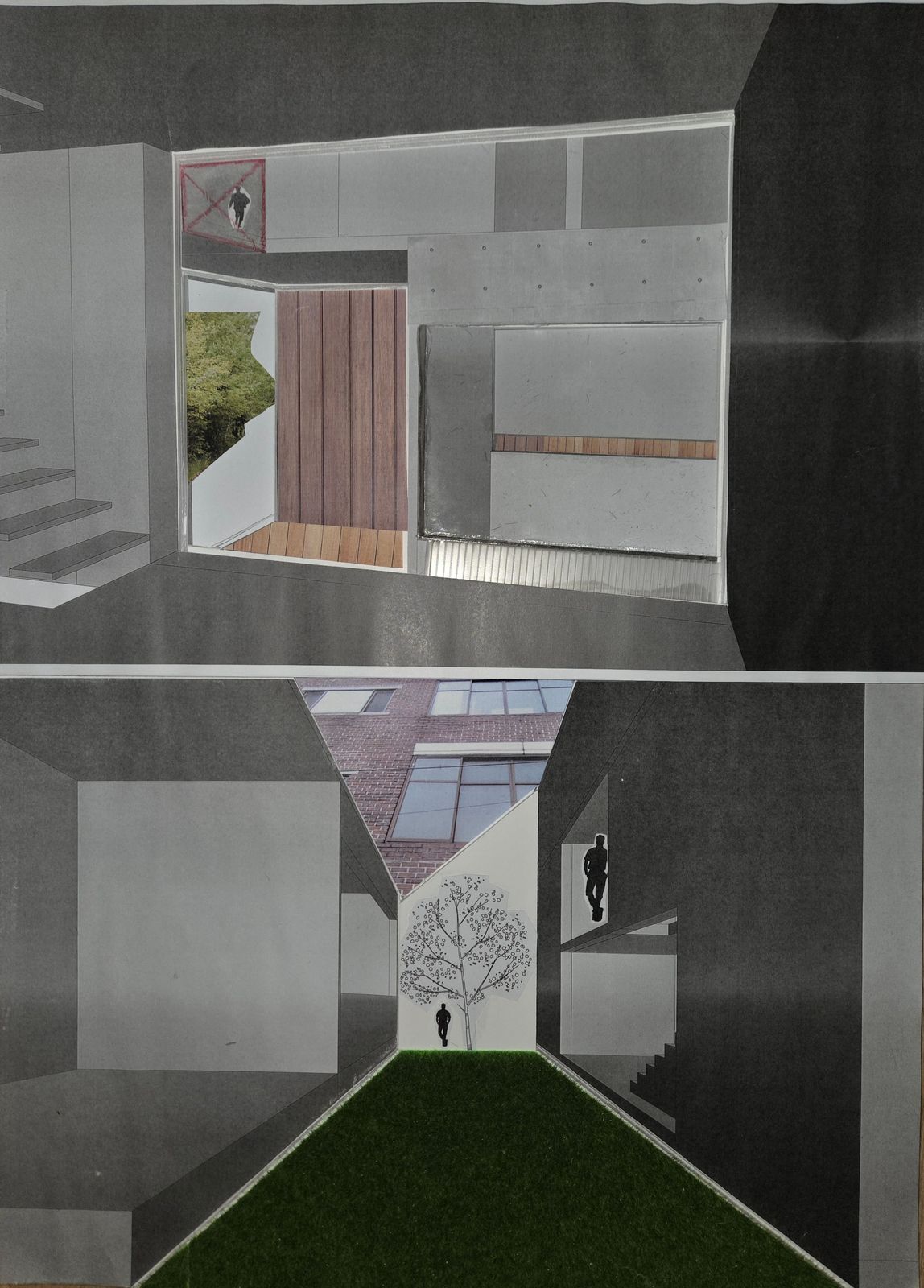 최종 결과물은 위와 같다. 내가 생각한 최적의 뷰포인트 두 개를 골라 입체로 만듦과 동시에 꼴라주 기법을 활용하여 위, 아래가 각각 하나의 장면과 같이 보이도록 했다. 내가 생각한 건축물은 사람이 활동하는 공간이자, 시선을 담는 매개체이다. 건축물 내외의 사람이 상호작용하며 건축물은 하나의 맥락을 가지고, 이를 표현하기 위해 위와 같은 작업물이 탄생했다.