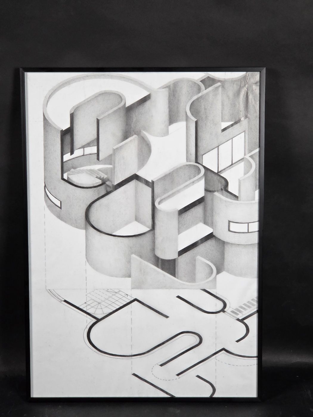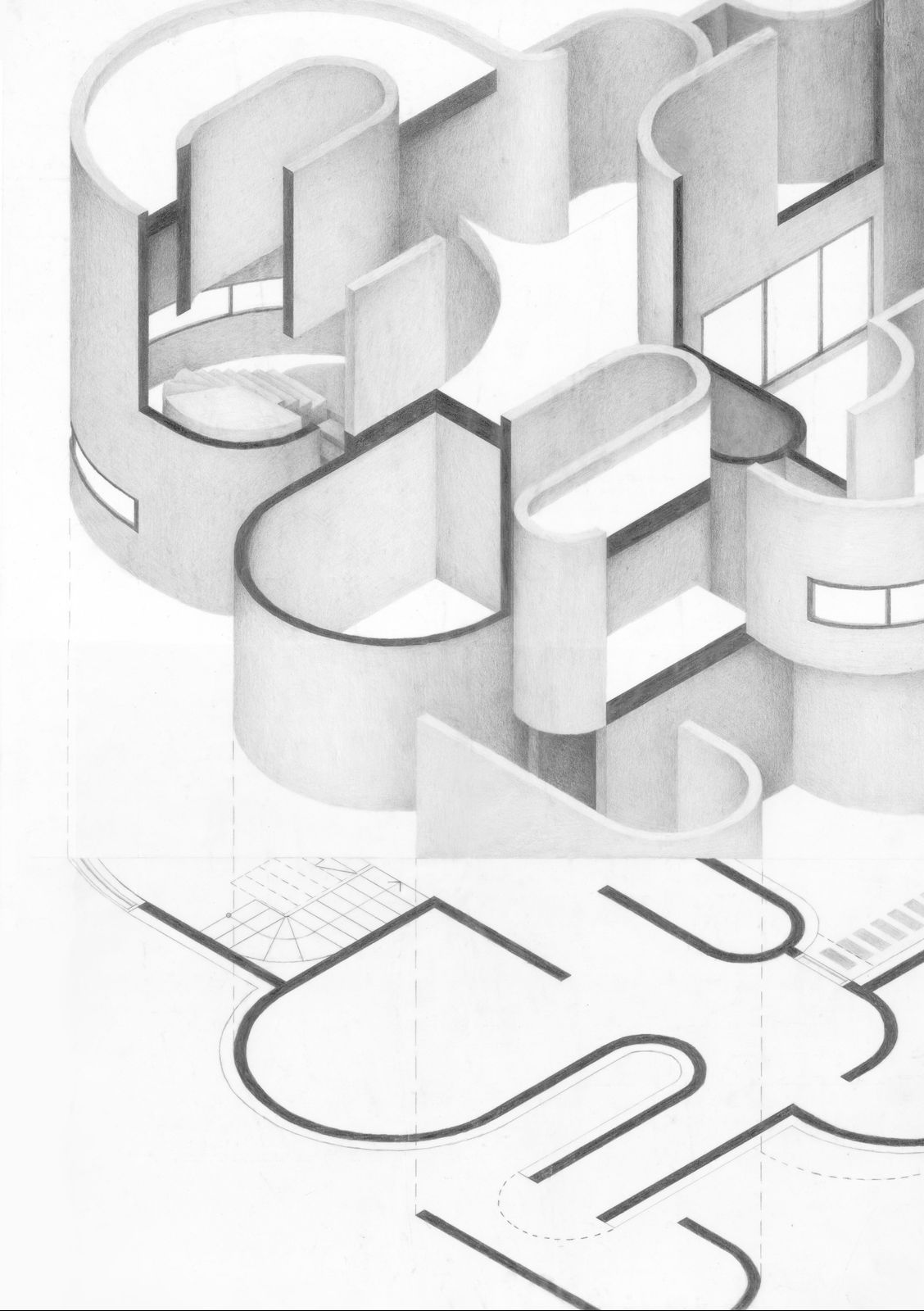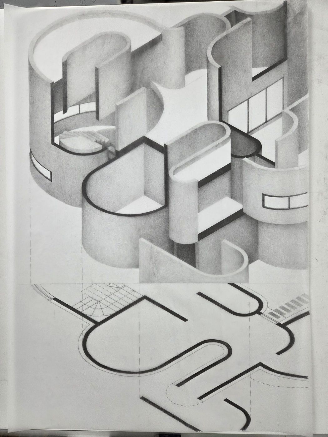 최소의 집 마지막 세 번째 단계인 표현과 소통하기에서는 어떻게 내가 설계한 최소의 집을 전달할 수 있을까 고민했다. 이전 과제를 돌아보며 고민해 보았을 때, 건물의 내부 공간이나 벽 그 자체를 잘 보여 주지 못했다고 생각을 하게 되었다. 도면을 통해서 벽이 어떤 방식으로 배치되고 구성되어 있는 지를 보여 주었고, 모형을 통해 건물의 전체적인 메스감과 벽이 어떻게 갈라지고 결합되는지는 잘 보여 주었다. 하지만, 실제 내부 공간이 어떤 느낌이고, 계단을 통해서 어떻게 다음 층으로 이동하는지, 그리고 벽을 외부에서 보았을 때 뿐만 아니라 안에서 보았을 때의 느낌이나 벽이 두께감을 가지고 위로 뻗어 있는 벽 그 자체의 느낌과 같은 것들은 잘 표현하지 못 했다. 그래서, 건물의 엑소노메트릭 드로잉을 바탕으로 건물 일부를 잘라내어 보여 주지 못했던 공간과 벽의 모습을 담고자 했다. 가장 많은 것을 보여줄 수 있는 건물의 전면부, 즉 거실, 다이닝을 중심으로 중정, 안방까지의 공간이 보이도록 벽을 잘라내었다. 또한, 벽을 강조하고 그 느낌을 극대화하기 위해 소묘의 방식을 통해 드로잉을 그렸다. 그럼에도 벽의 배치(평면)는 건물을 설계할 때 중요한 요소였기 때문에 엑소노 드로잉을 아래 쪽으로 사영시킨 평면 드로잉을 함께 그렸다.