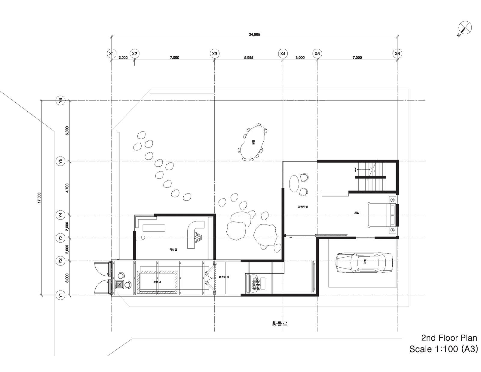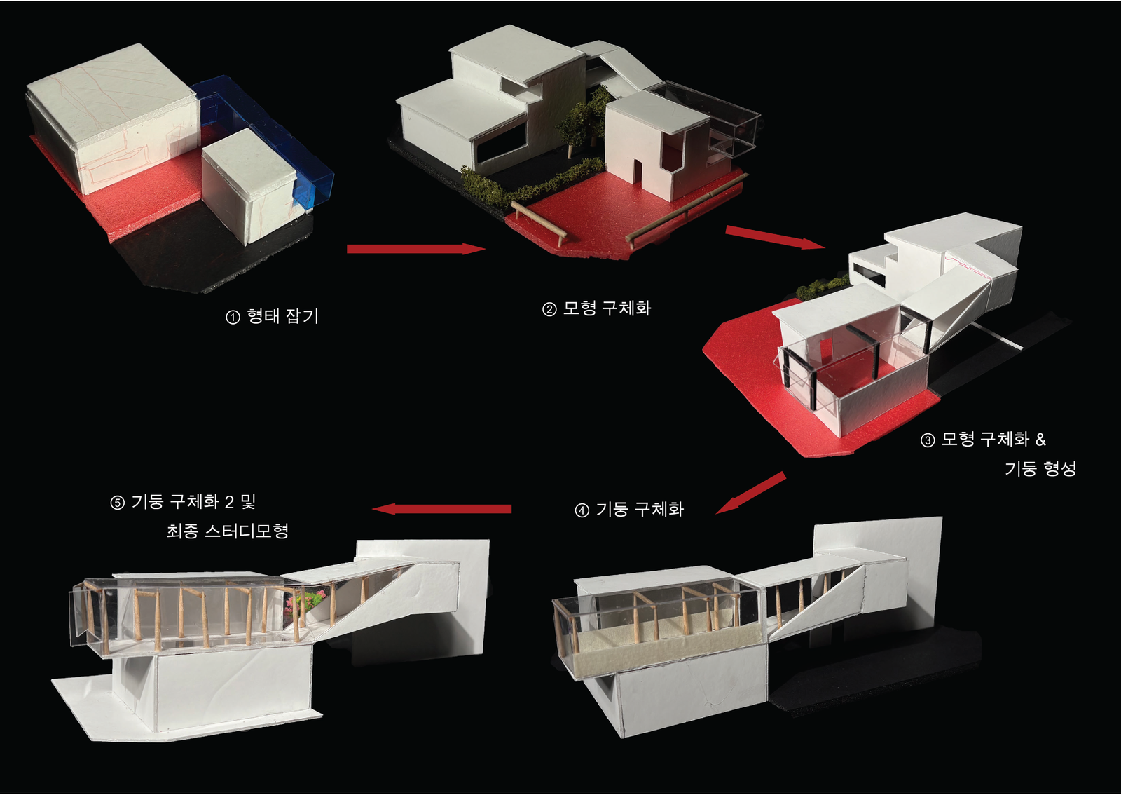 이렇게 도면을 다 그리고 난 후 최종 페널을 만들 때, 생츄어리의 시선과 공간의 흐름에 집중하여 동선을 메인으로 장면을 네 가지로 나누어보았다. 거주자가 이 공간에서 무엇을 느낄 수 있는지 언제 이 공간에 오는지 등을 가장 중요하게 생각해 아래 사진처럼 가운데에 있는 도면을 중심으로 시퀀스를 나타보았다. 이번 과제 2를 하면서 공간 성격을 어떻게 나눌 수 있는지, 어떻게 더 효율적으로 드러낼 수 있는 지 배울 수 있었다. 하지만 공간의 흐름에만 신경쓰다보니, 거주자가 생츄어리 실외 부분에서 자신의 작업실을 보는 그러한 과정을 자세히 다루지 않아 아쉬운 점이 있었다. 다음 과제 3에서 그 부분을 보안해보겠다.