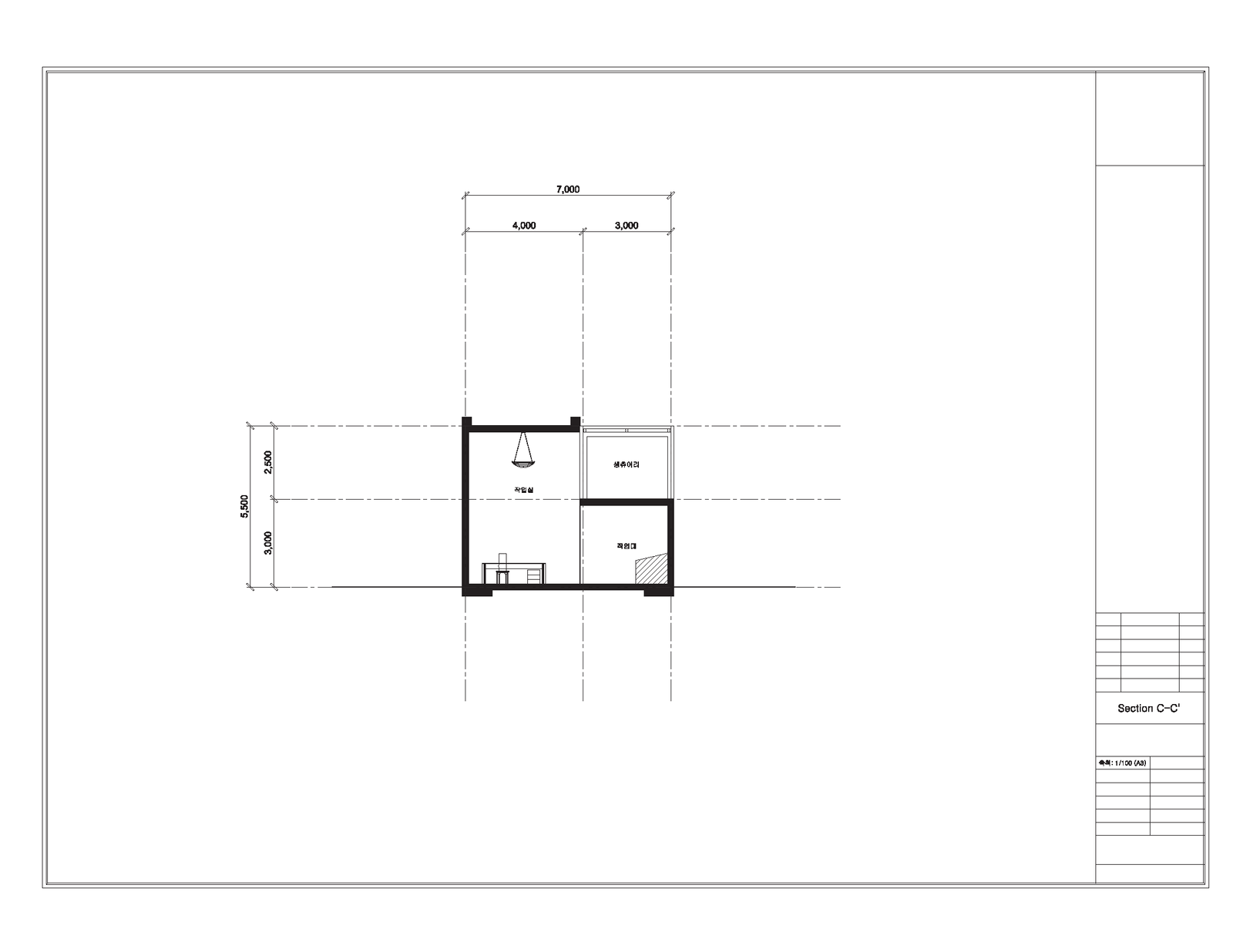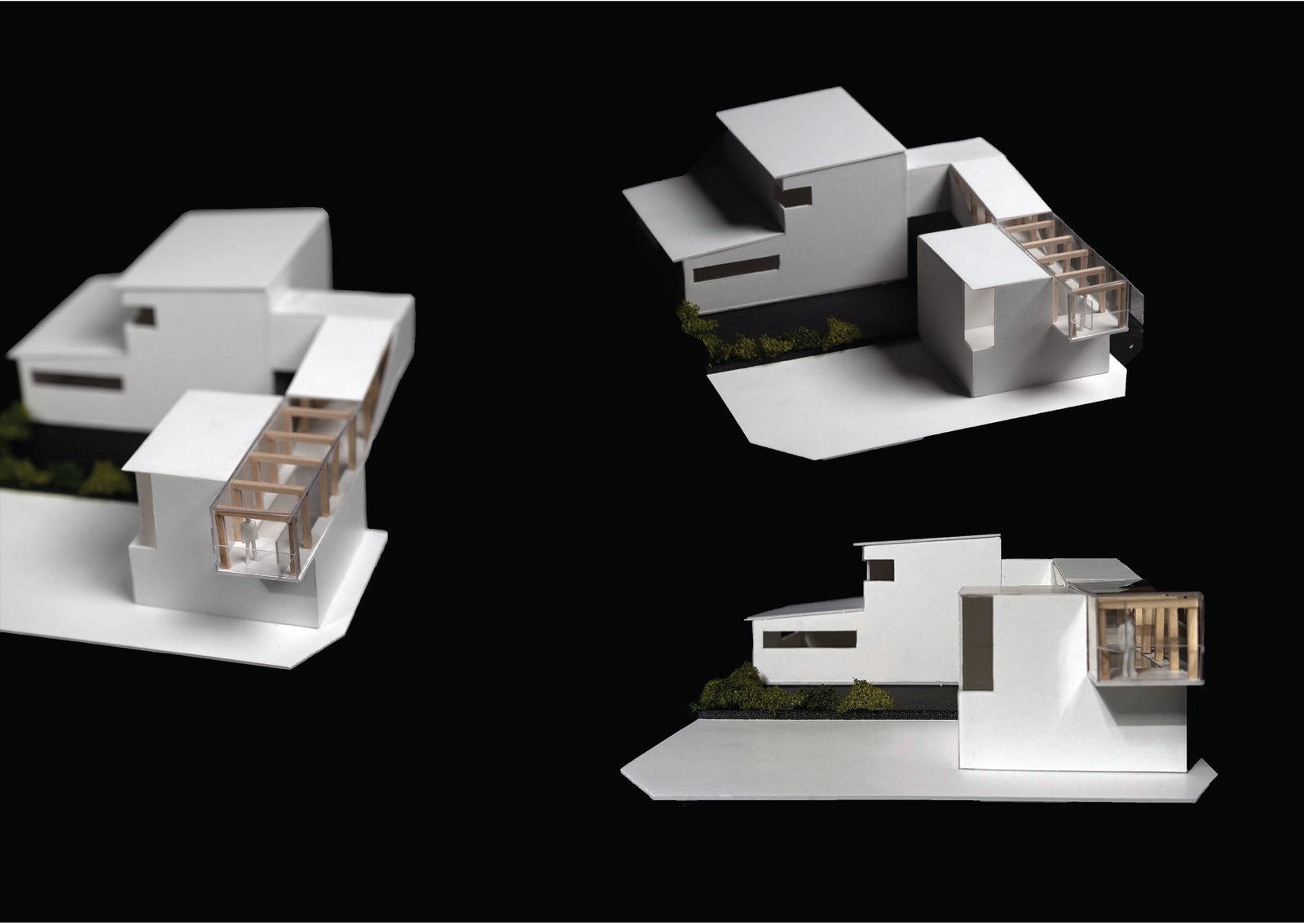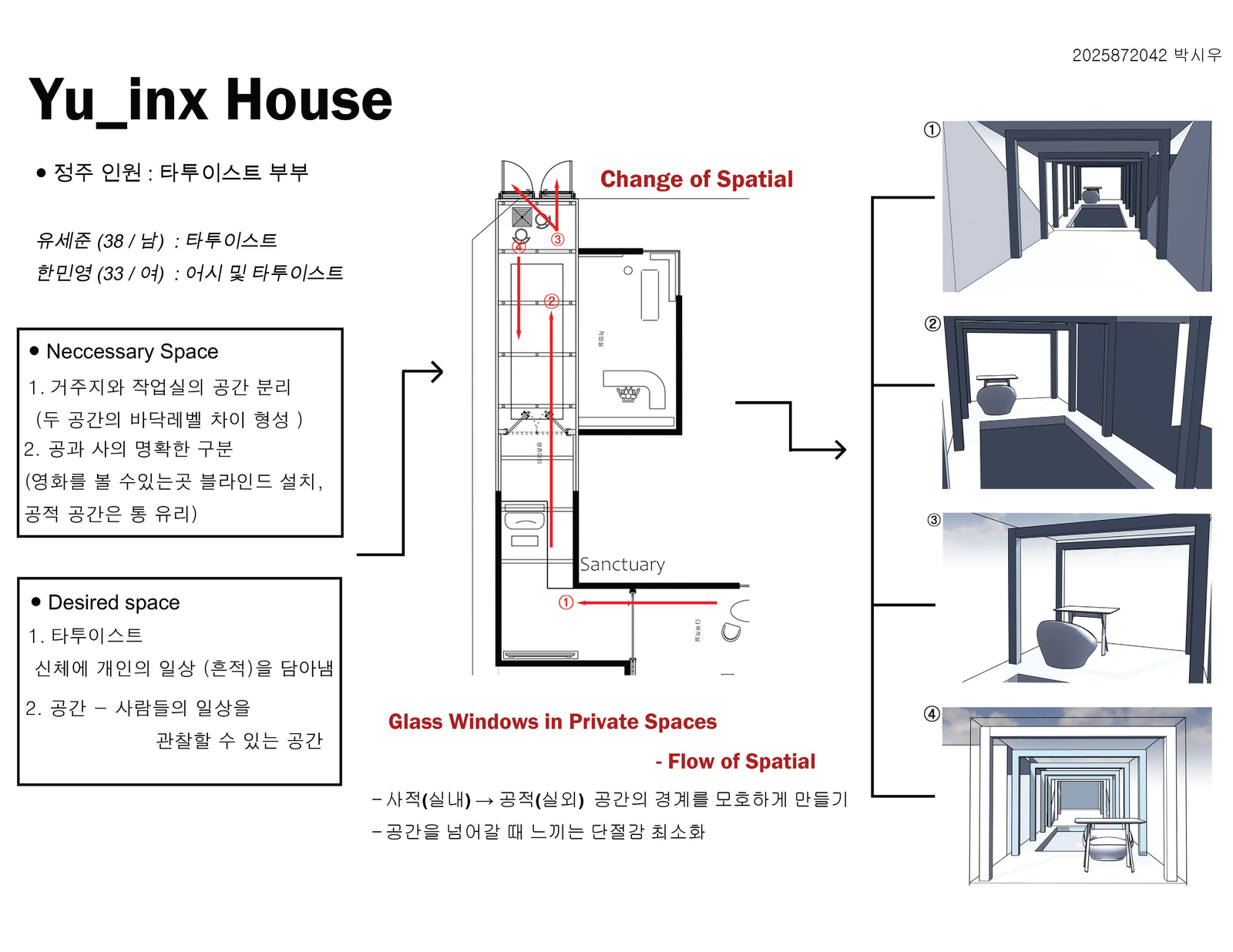 여러가지 스터디 모형을 만들어본 결과 가장 중요한 장소는 말 그대로 생츄어리가 되었고, 실내에서 뻗어나와 바깥까지 볼 수 있는 이 공간의 성격을 규정해야했다. 가장 바깥쪽인 부분은 마치 테라스처럼 실외공간으로 보이지만, 더욱 안쪽으로 들어갈수록 실내 공간의 성격을 띠었다. 그래서 처음에는 옆면의 유리 벽의 형태를 넓혀 실내와 실외의 흐름을 자연스럽게 느낄 수 있게 만들었다. 또한 공간의 흐름을 자연스럽게 느낄 수 있지만 공간의 성격을 나누기 위해 유리문을 달았고, 생츄어리의 실내 부분에서는 거주자가 개인 취미를 즐길 수 있는 미니 영화관을 만들고 블라인드를 설치 해보았다. 실외 부분에서는 바닥을 유리로 만들어 작업실 내부가 잘 보일 수 있게 형성하였다. 바닥에서는 자신의 타투 도안이나 잉크, 바늘 등을 볼 수 있다. 자신의 시선의 흐름을 본인 작품과 예술에 보이게 하기 위해서이다.