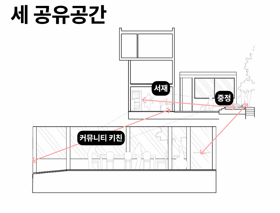공용공간인 서재, 중정, 커뮤니티 키친은 노부부의 생활공간과 연결되어 있는 반면, 청년들의 원룸과는 실외공간을 사이에 두고 있어 평소엔 노부부가 주로 사용하는 공간이다.