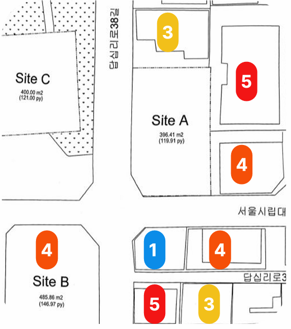 이에 걸맞는 사이트는 A가 유력했다. 도로와 외부인의 왕래로부터 적당한 거리를 두고 있으며, 공원을 관망하는 것과 채광에 유리했기 때문이다.